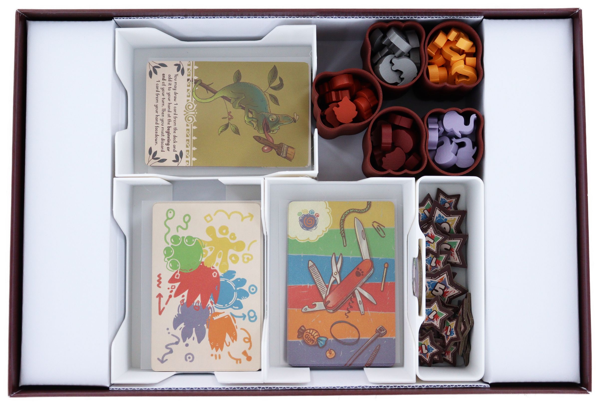 The Organizer also supports you on the tabletop. The game pieces are always within reach, exactly where they belong - with the players. Each player receives their own insert with the matching wooden Animal tokens. The cards are also sorted in an organized manner on the game table.