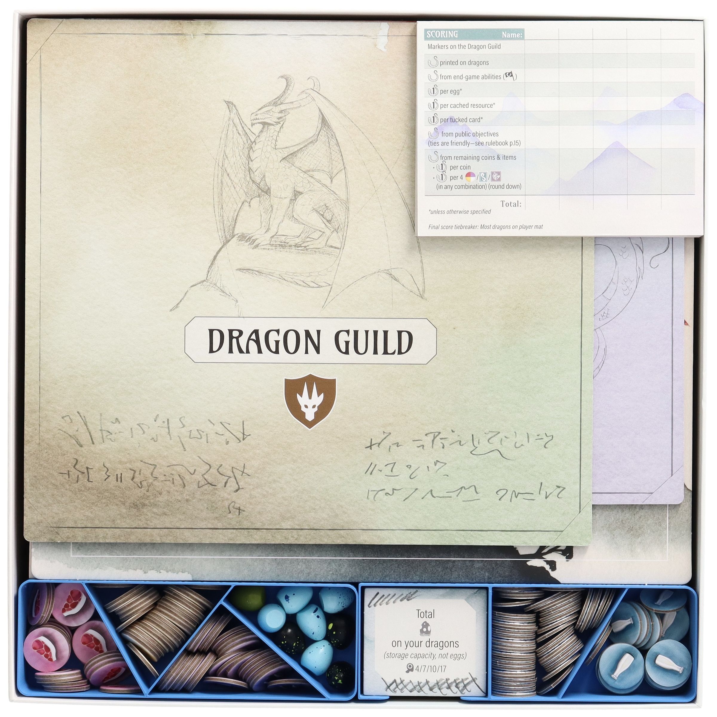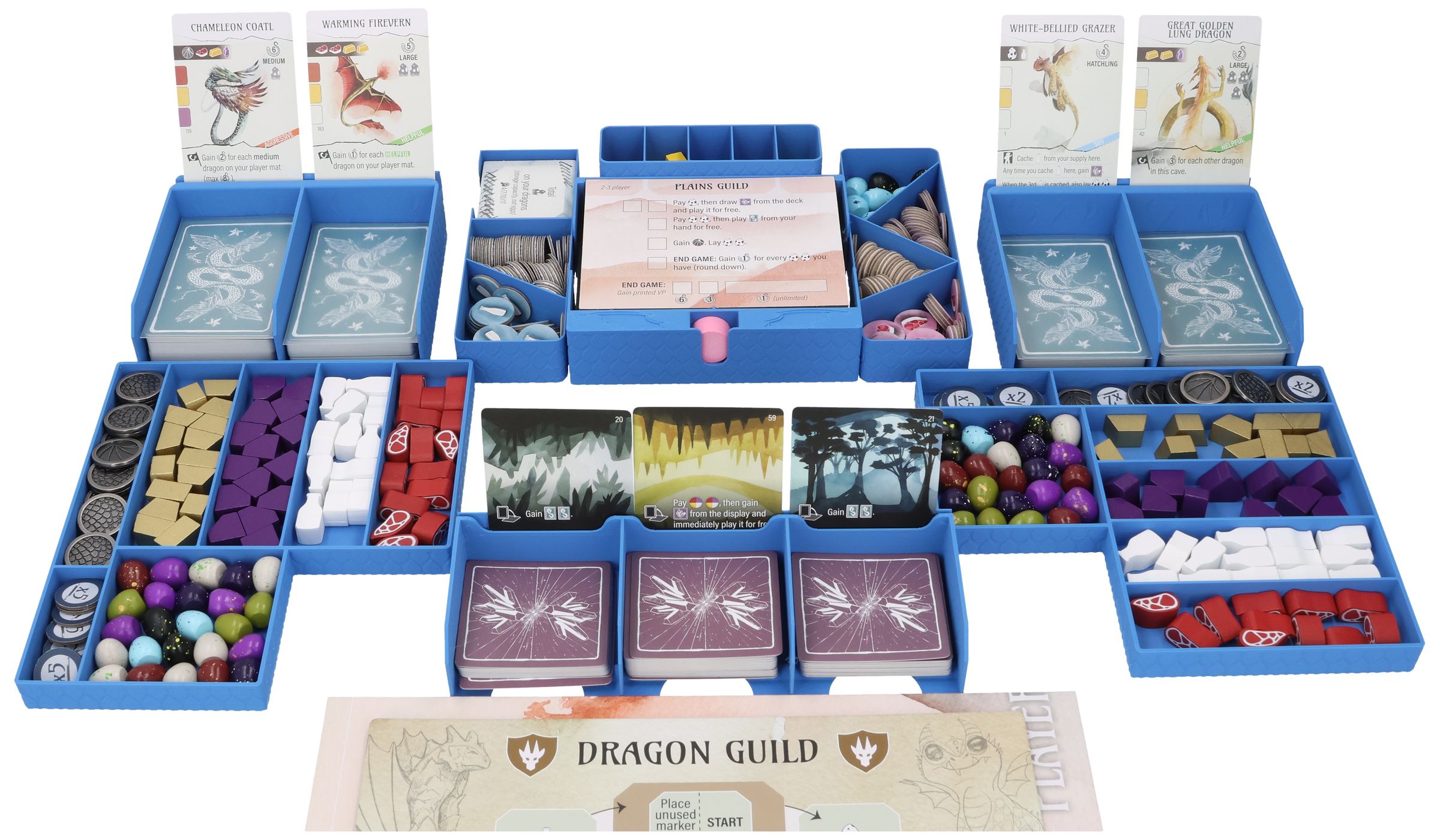• Larger game components, such as the Dragon Guild Board, Guild Tiles, Card Display and Tracker Boards, Player Mats, Score Pad and rulebooks are placed on the plastic inserts.