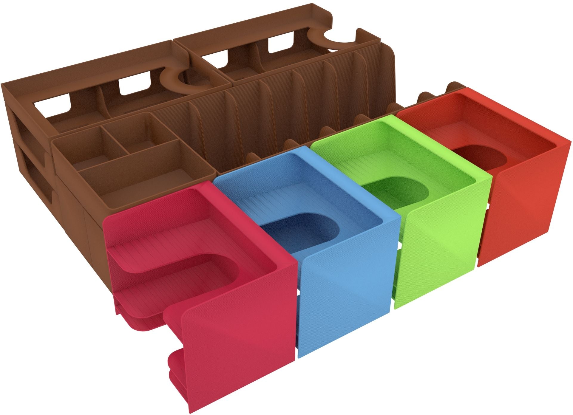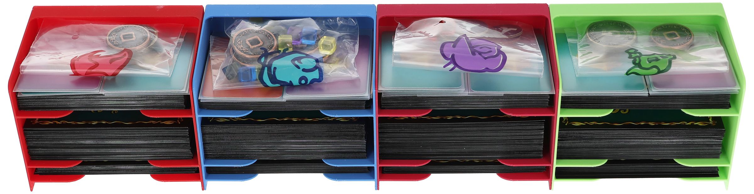 • Each character receives their own customized player tray in the respective character colors. The cards are sorted by type: