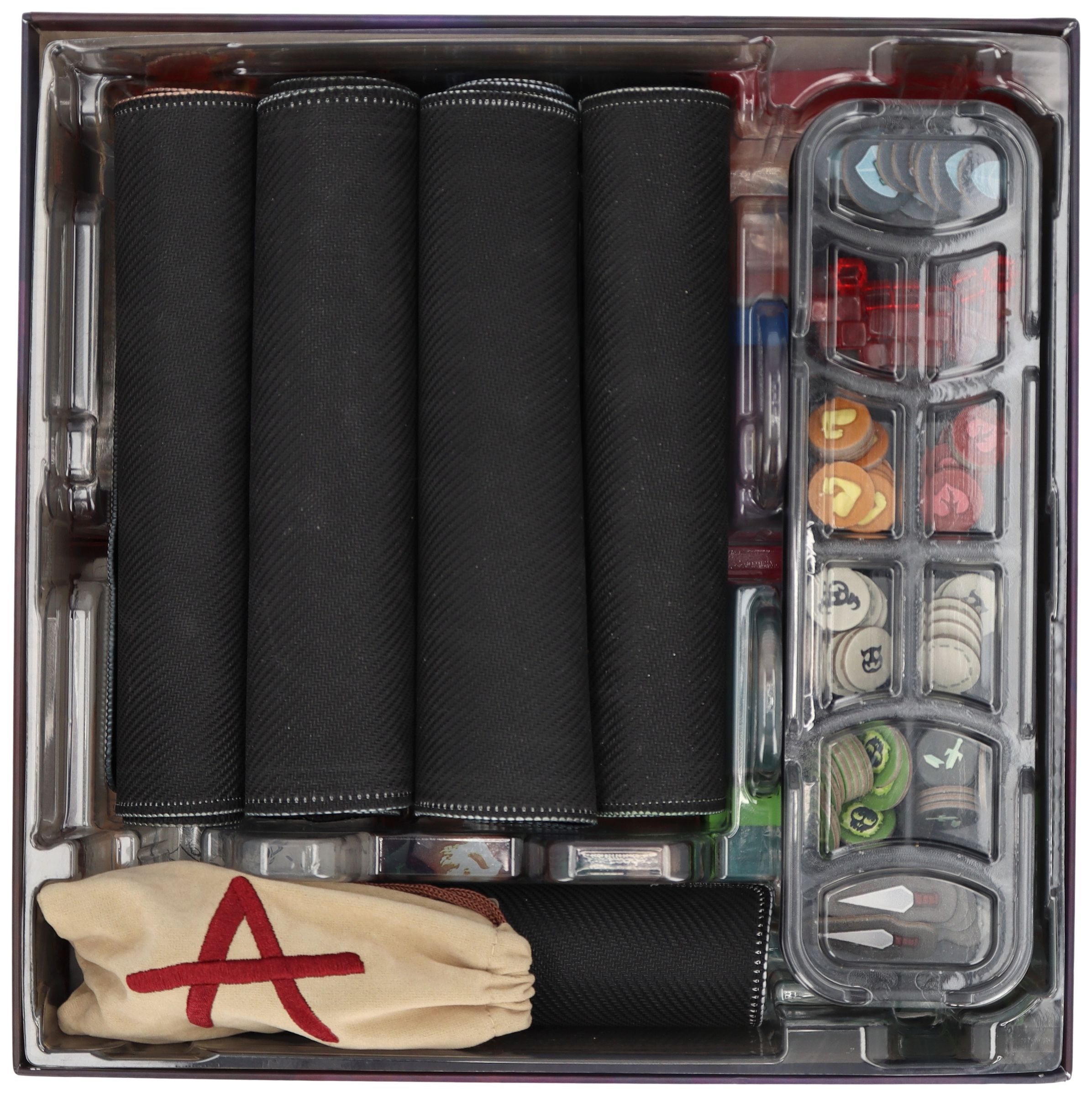 • The neoprene character playmats, the original, filled plastic token tray and character miniatures are stored in the original plastic insert (see photos).
