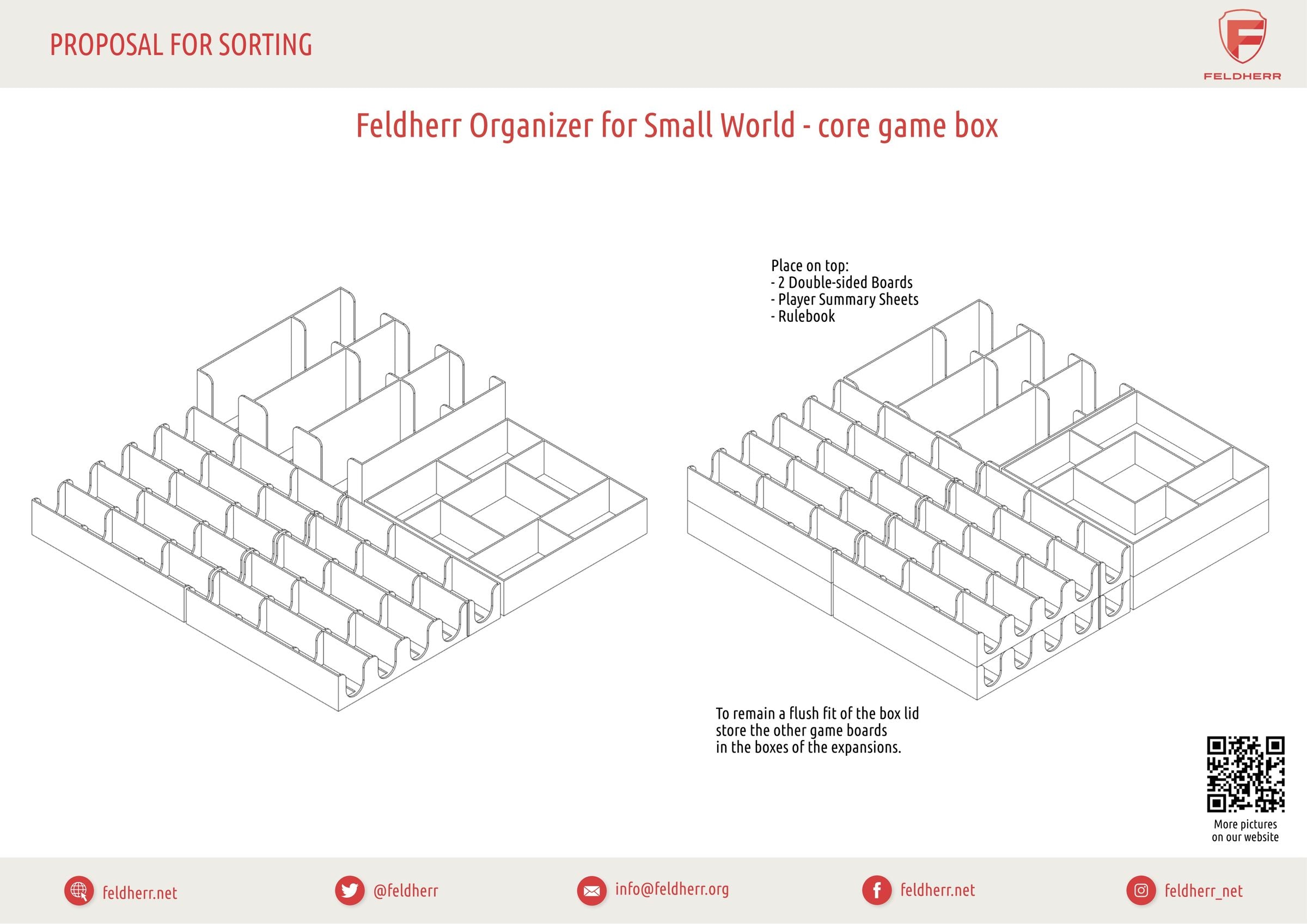 To ensure this goes smoothly, there's the matching Feldherr Organizer for your core game box. With it, you get the game material of the core game and five expansions easily under control. Your game material will not get mixed up and will not interrupt the game's flow.