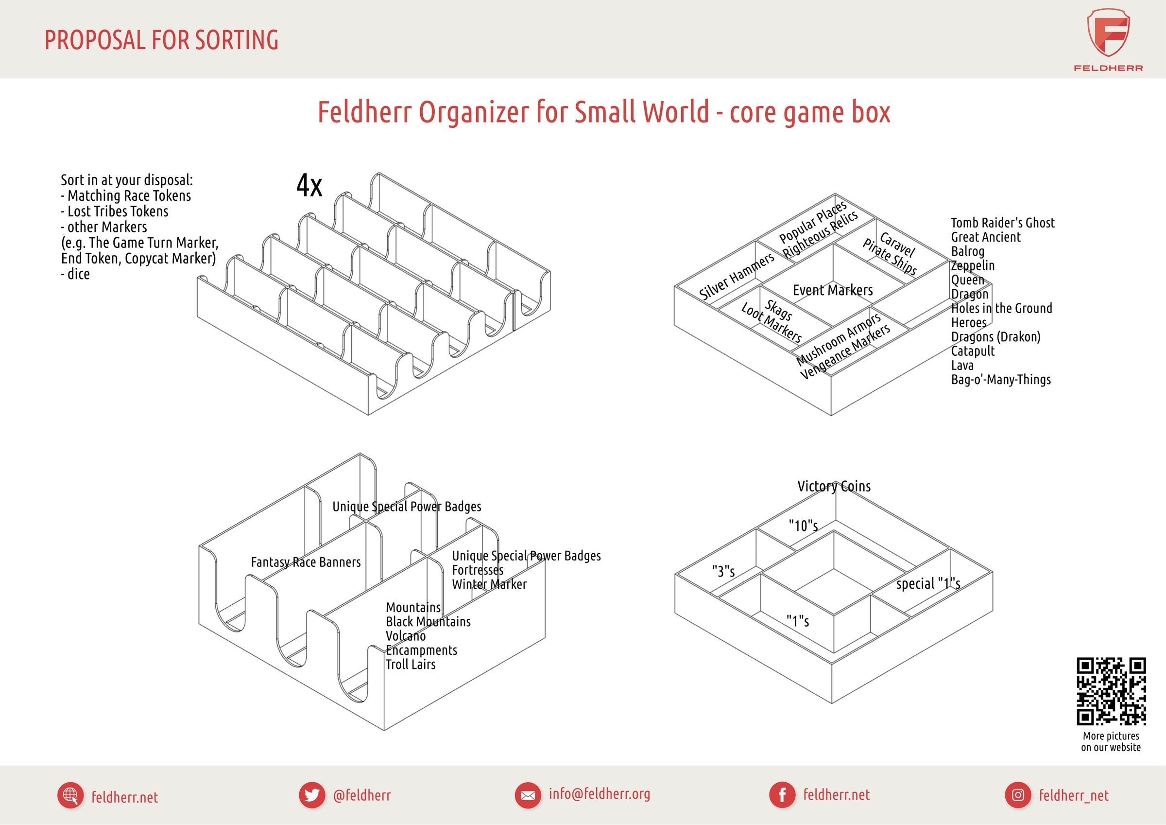 - 1 plastic token holder with 8 compartments for Race banners, Blank banners, Special Power badges, blank badges + larger game tiles like Encampments, Mountains, Volcanoes, Holes-in-the-Ground