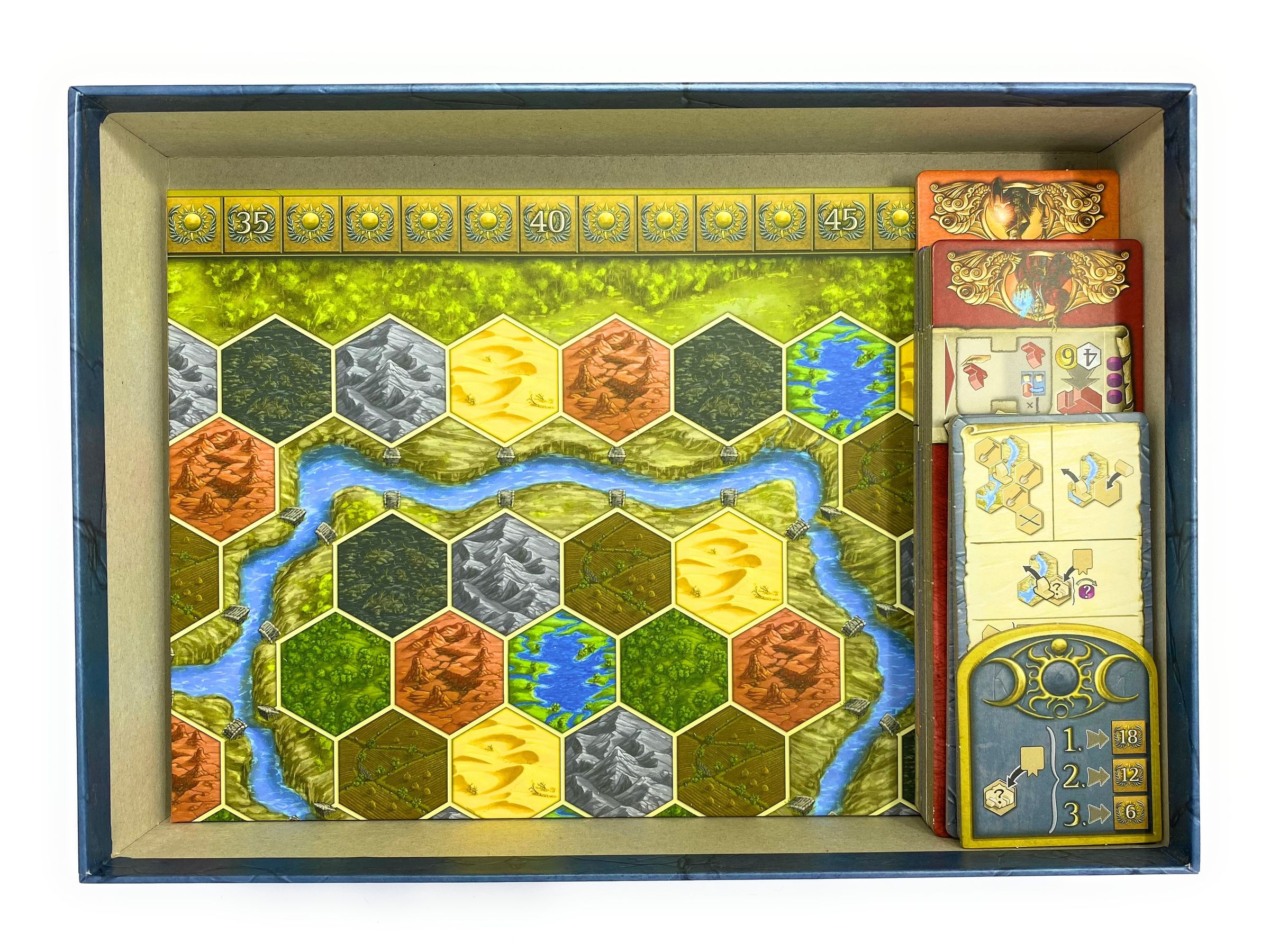 • 2 token holders with 2 compartments each for turn Bonus cards, Favor tiles, Dock markers and Range tiles.