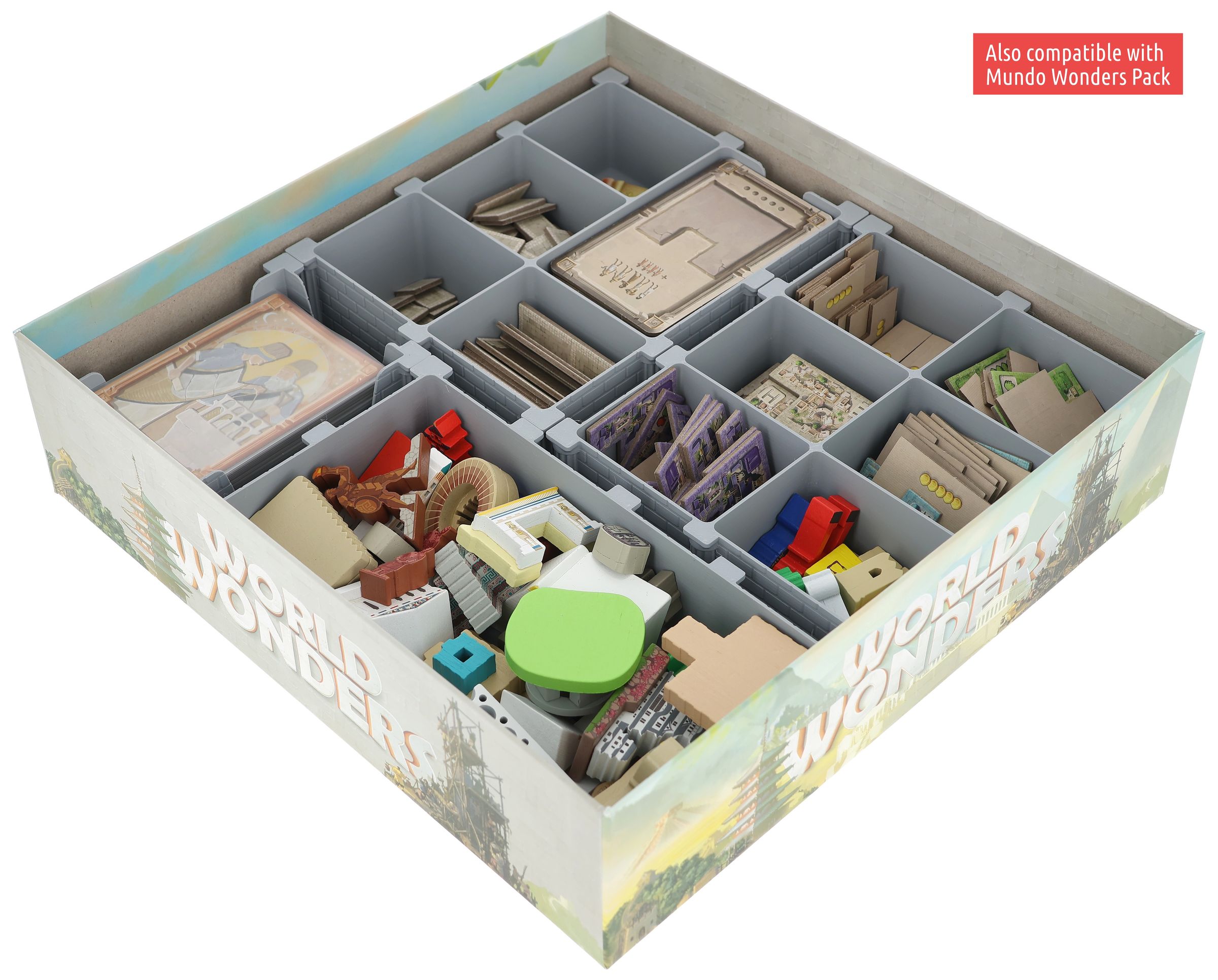 - It provides space for all the game components of the core game. There is also space for the game material from the “Mundo Wonders Pack”.