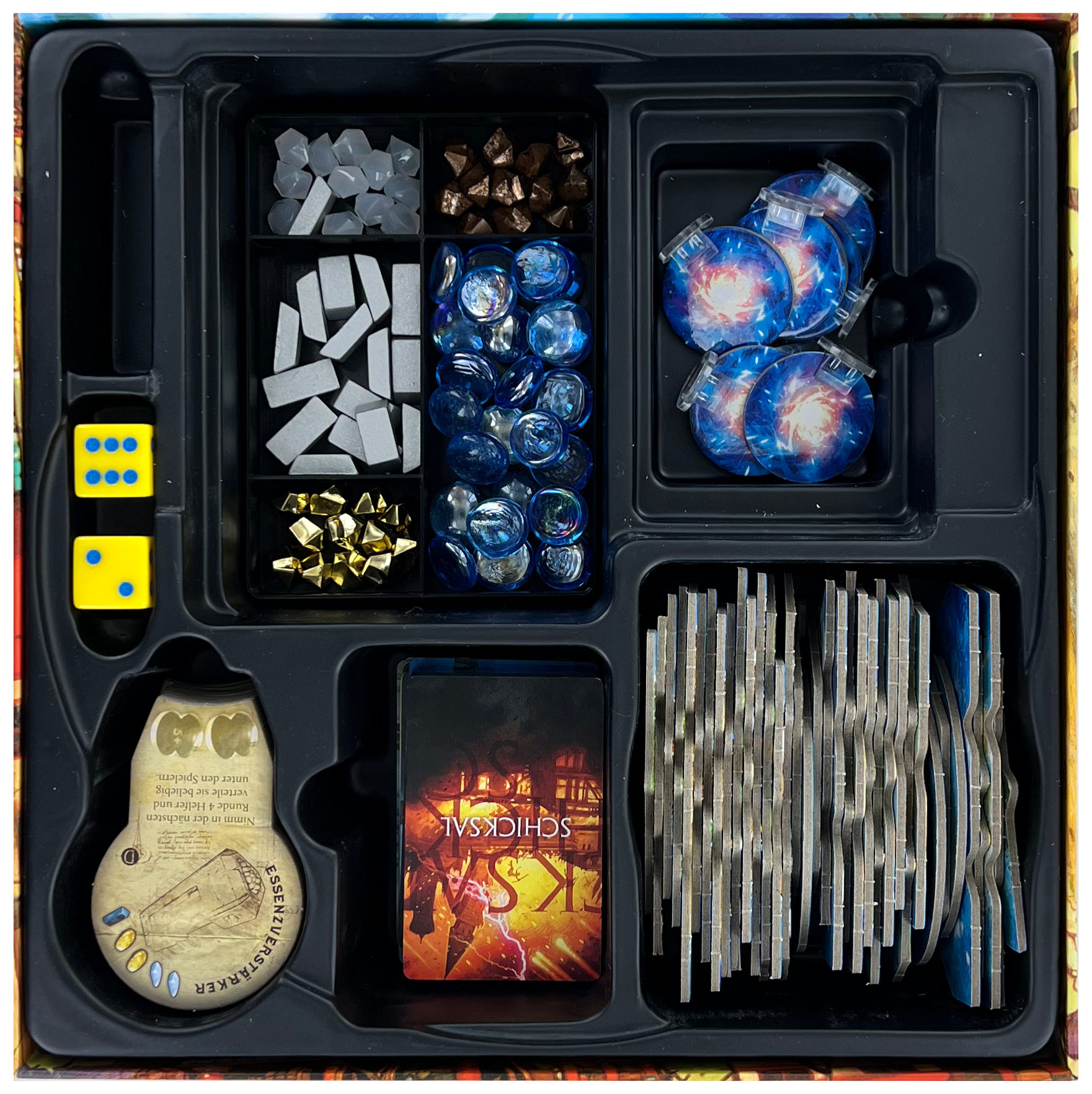 - 1 plastic token holder with 5 compartments for resources like mystic energy, crystals, Meteoric Iron Or, gold nuggets and atlantium metal bars.
