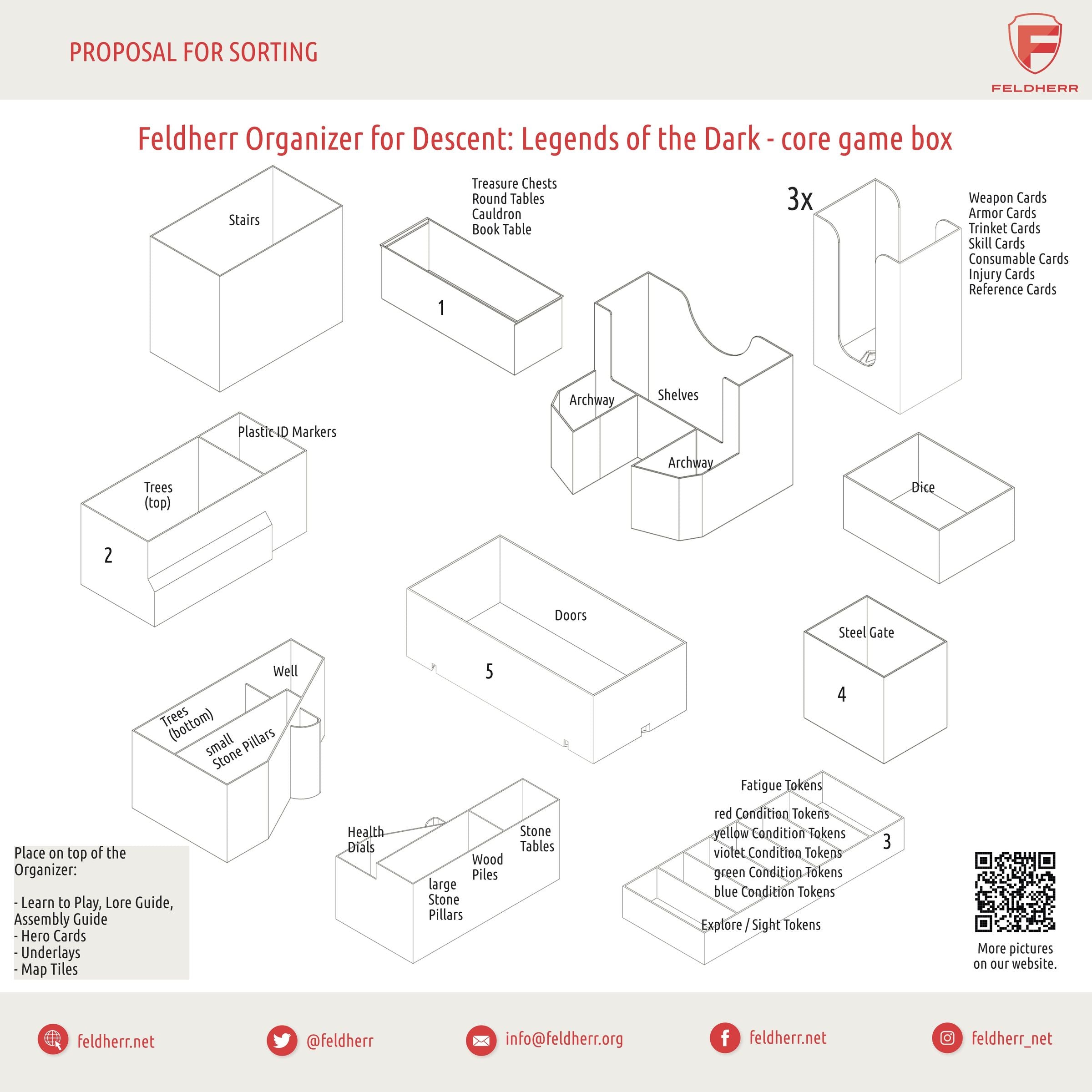 - The Organizer fits exactly into the original board game box of the "Descent: Legends of the Dark" core game by FFG. It is placed into the upper box.