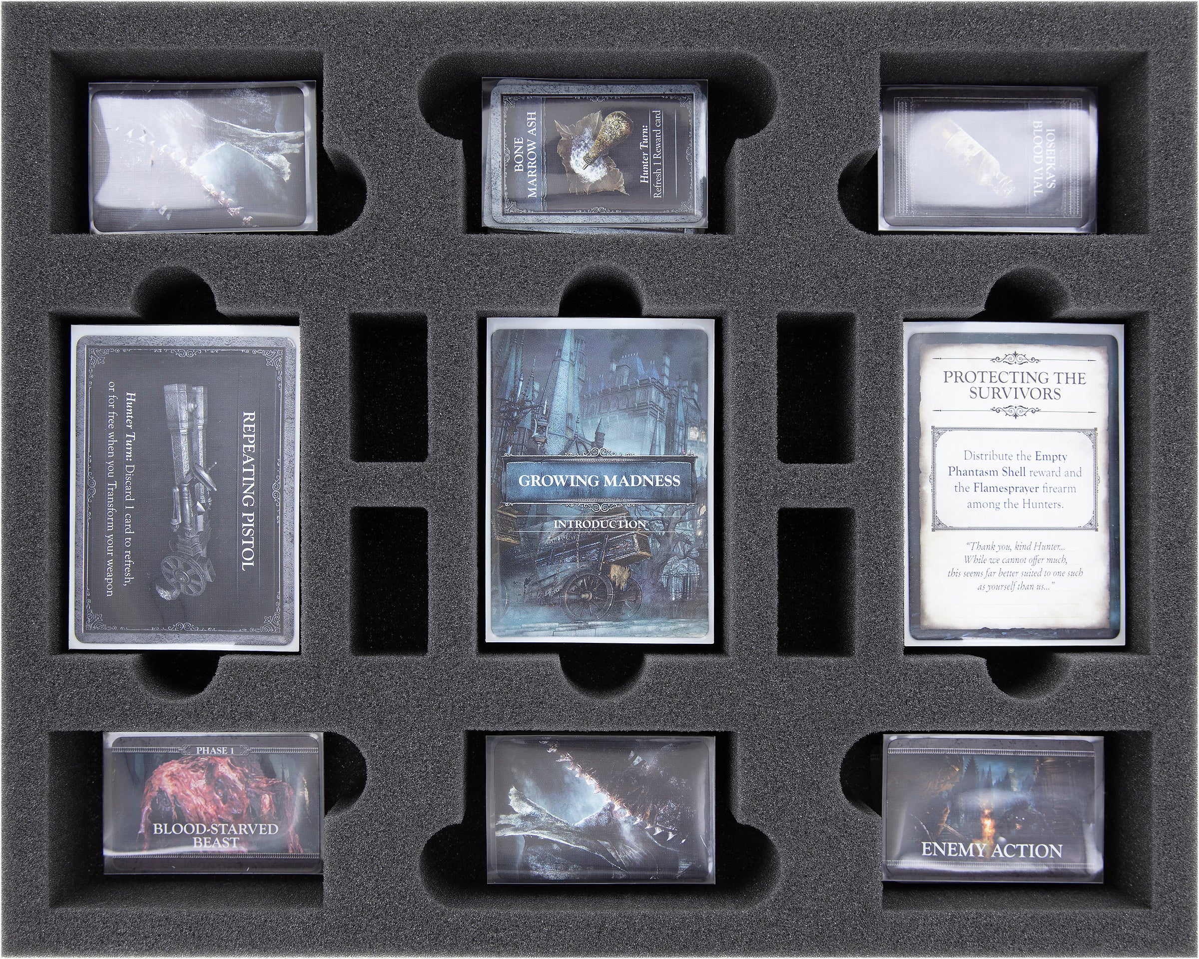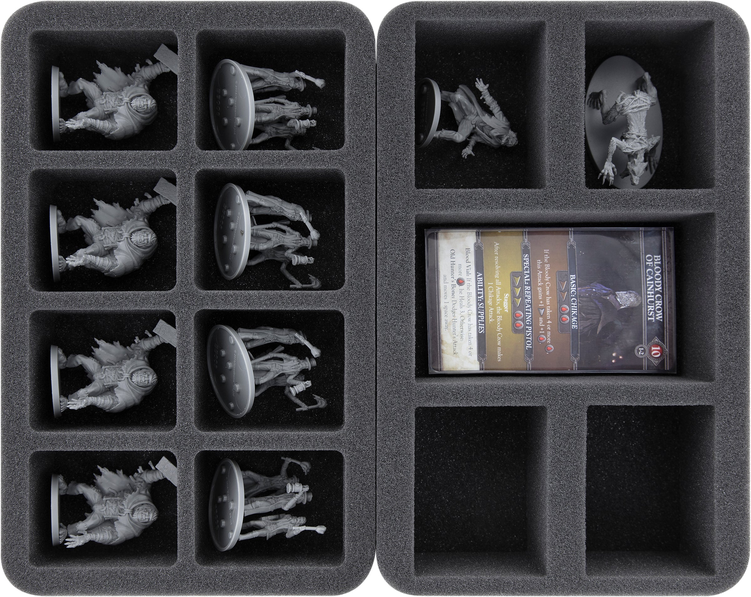 • The bundle provides room for all miniatures, game cards, and complete accessories from the "Bloodborne" core game, every expansion, all Optional Buys, and every unlocked Stretch Goal from the Kickstarter campaign.