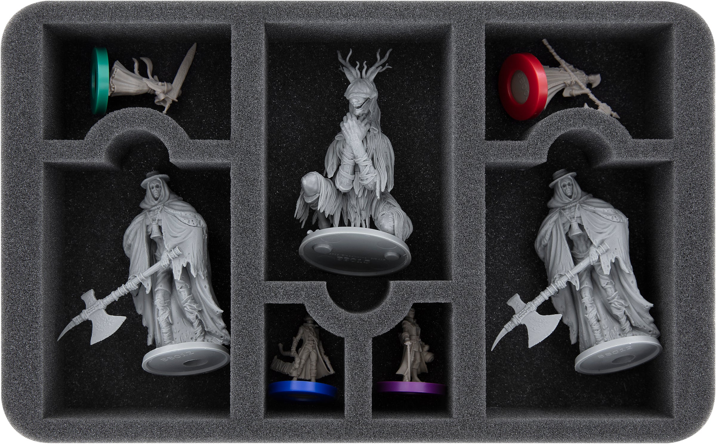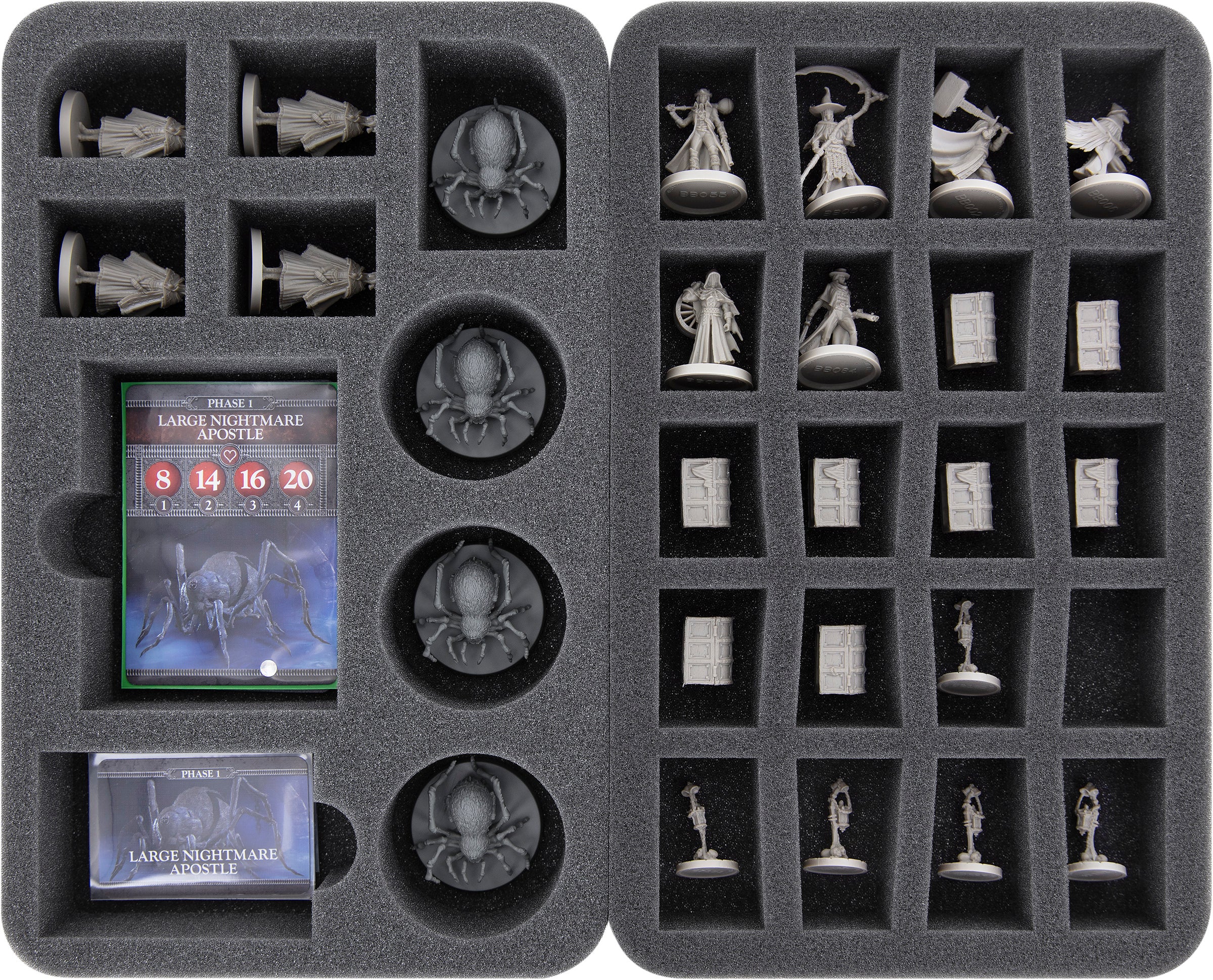 Two Transporter Bags, six Storage Boxes, and two Full-Size and 34 Half-Size foam trays ensure that all 209 miniatures (142 Enemies, 30 Hunters, 20 Bosses, as well as 8 Chests, 5 Lamps, and 4 Dolls) and all the game materials from the Bloodborne Kickstarter campaign are safely and neatly stored.