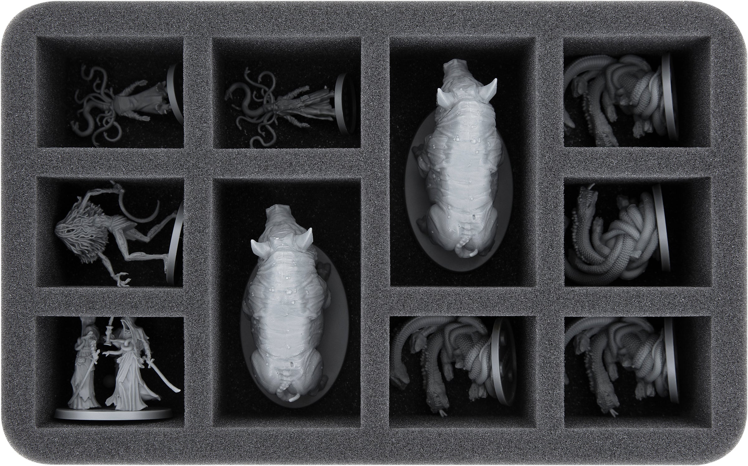 No matter if it's a simple Doll, "Ebrietas, Daughter of the Cosmos" or "Vicar Amalia", each figure gets the matching compartment. Thanks to the custom-fit cut, the miniatures have a tight fit and do not slip during transport. The soft, fine-pored foam protects delicate details from breaking off and the colors of your painted models from scratches and paint abrasion.
