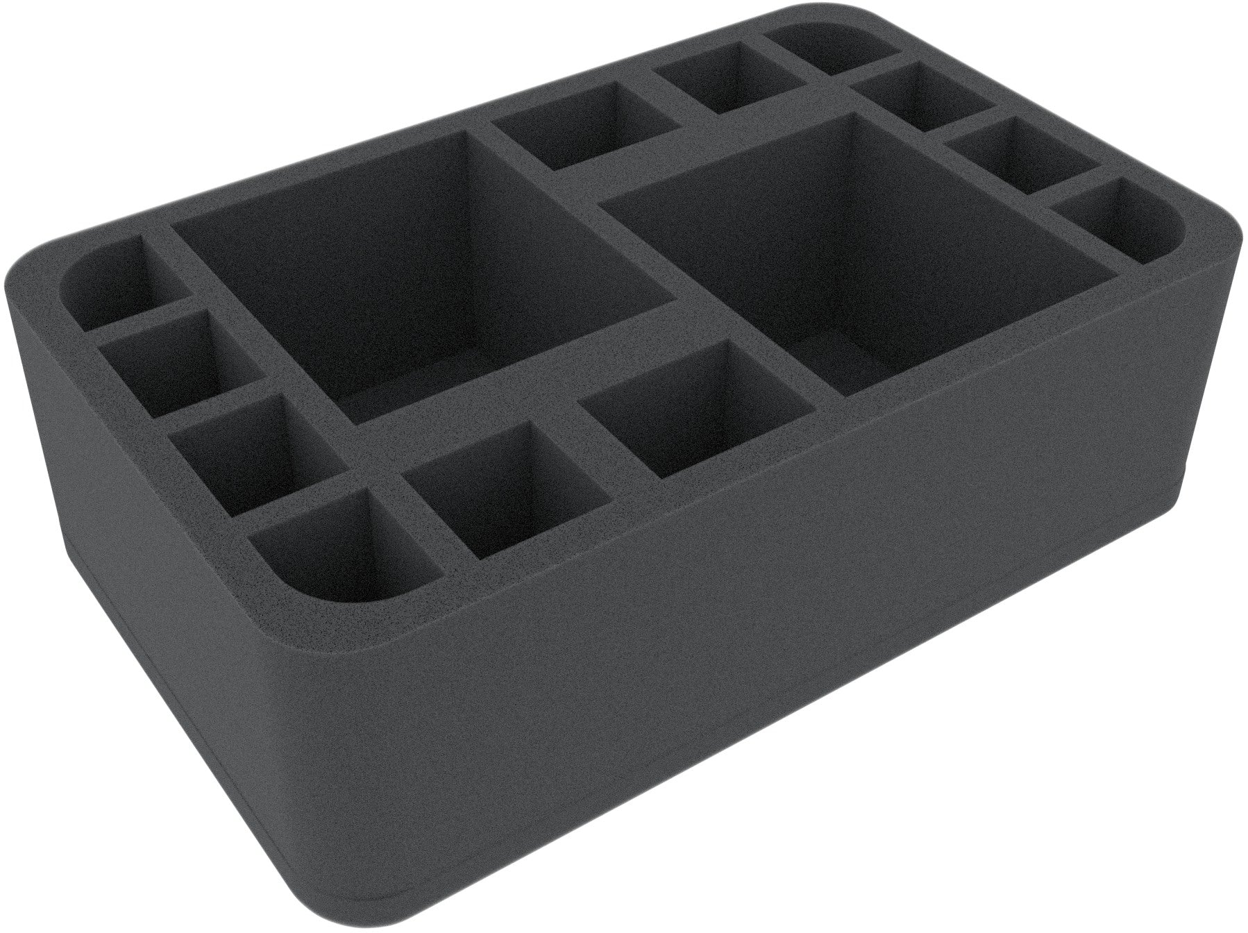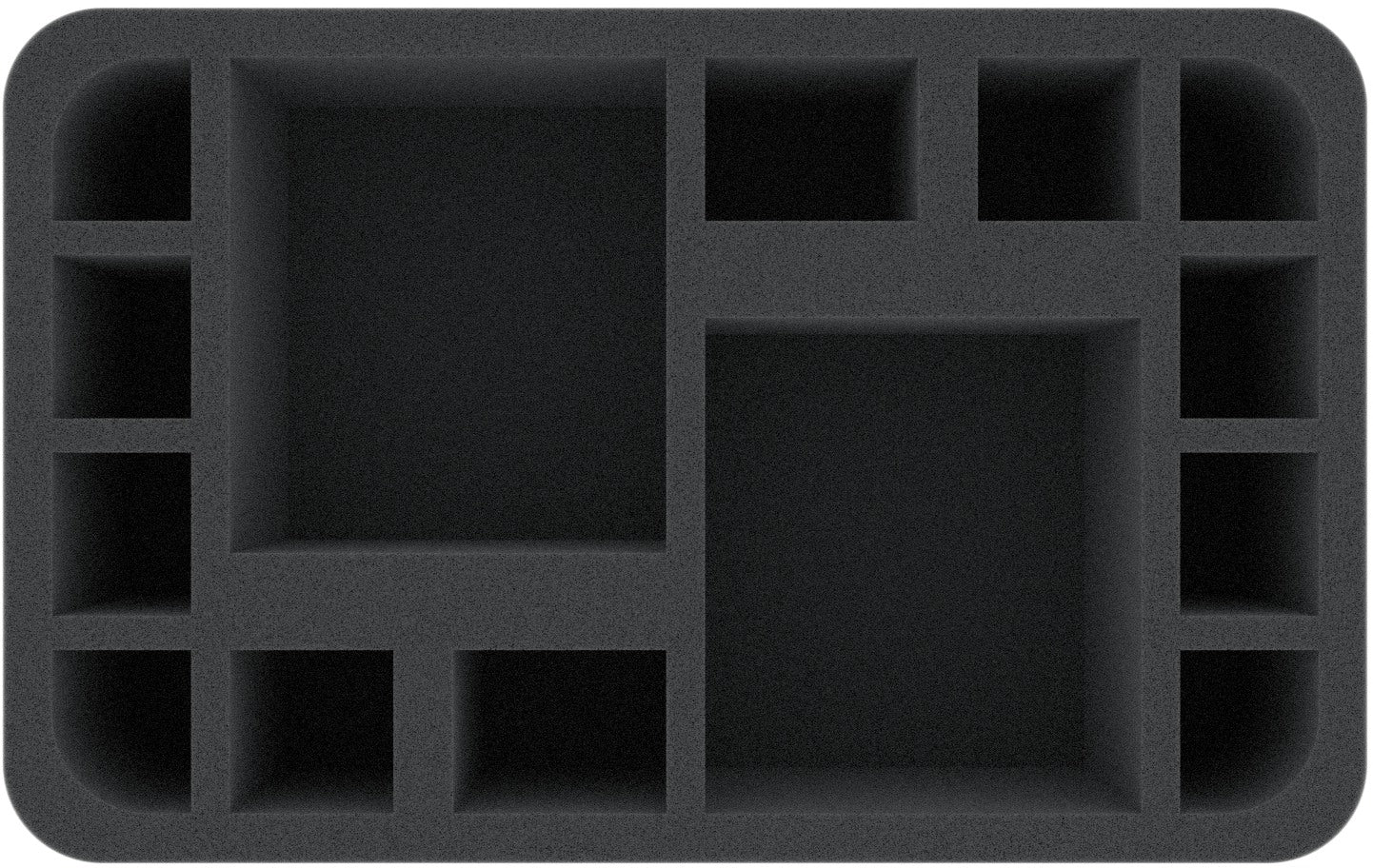 This Half-Size foam tray is divided into 14 compartments of different sizes. It is particularly suitable for the safe storage of small to medium-sized figures for various board games and tabletop systems. Game material or other small parts can also be neatly stowed here.