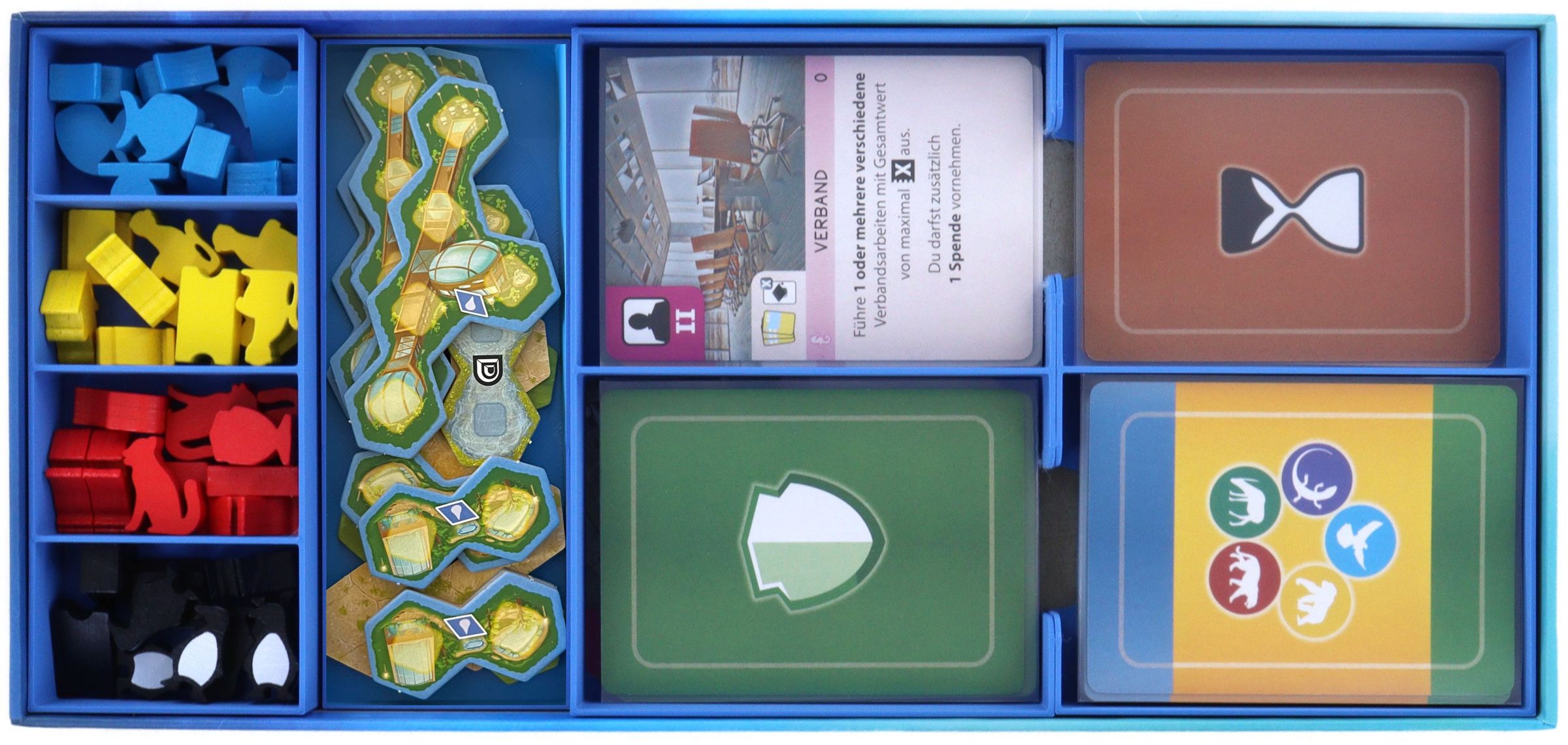 A modern zoo naturally needs an aquarium. With the Marine Worlds expansion, marine creatures move into the Ark Nova. We've developed a fitting Organizer for the expansion's board game box to ensure you're not left high and dry, and your game components don't end up in disarray. This way, you always keep track of your playing cards and the small-sized game materials and access them easily.