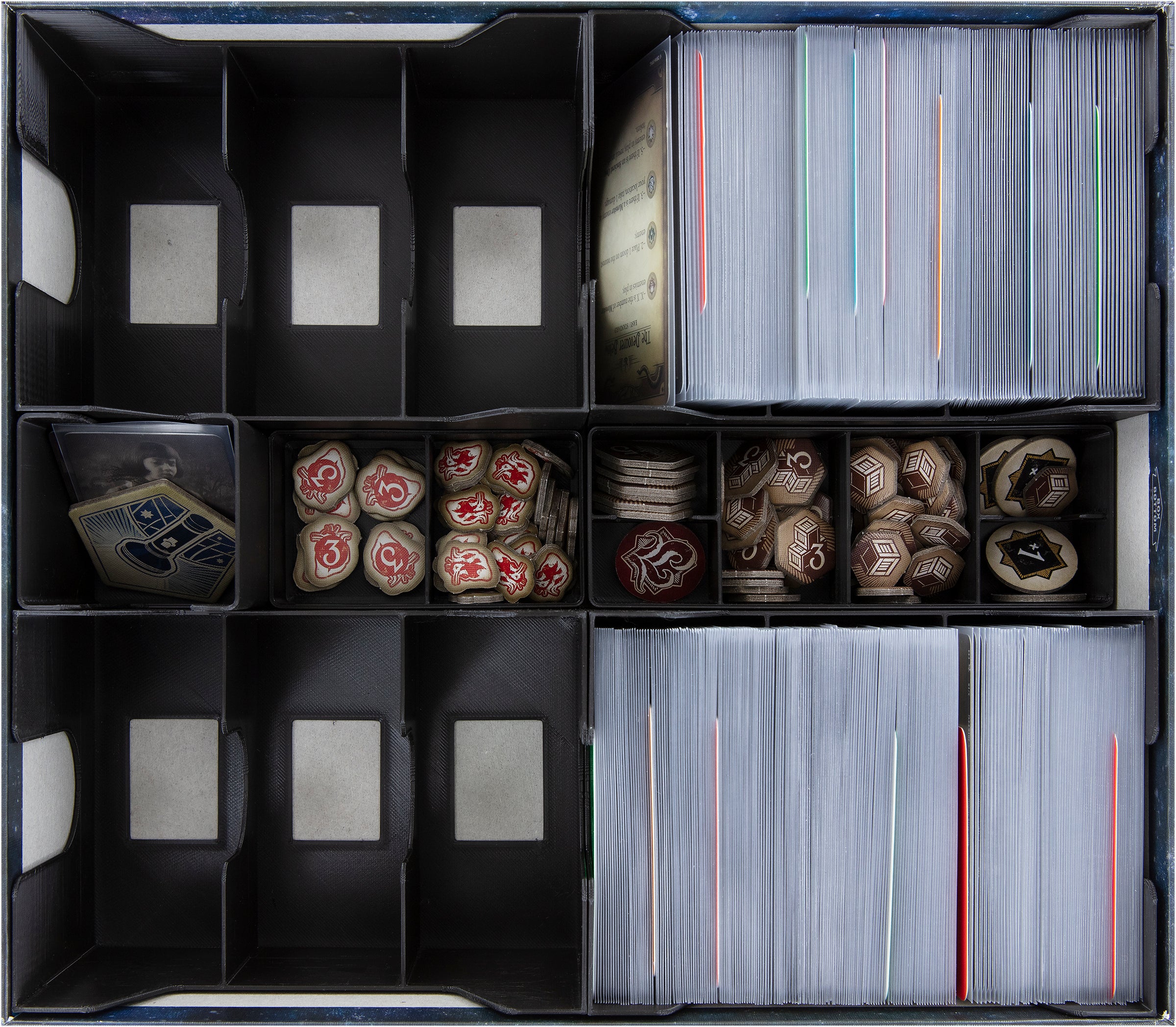 - It provides space for all game cards, tokens, and Investigator Mini-cards from the core game.