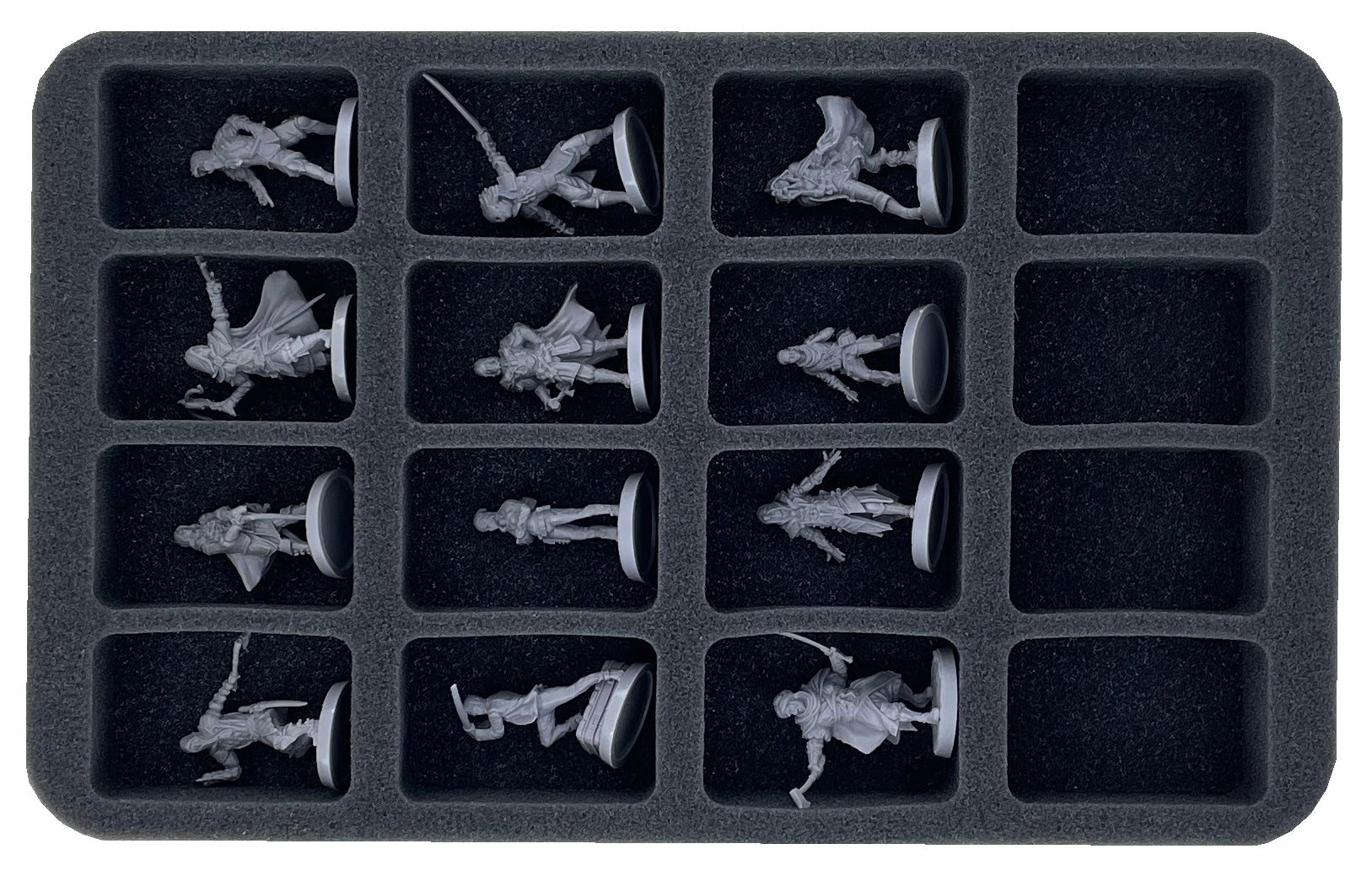 • 1 Half-Size foam tray with 16 compartments for small miniatures like Alif, Sirius Favero, and his Crows, Kiyoshi Takakura, Rebecca Crane, Layla Hassan, Cesare Borgia, Beatrice, Clara, Domenico (HS035BF05BO)