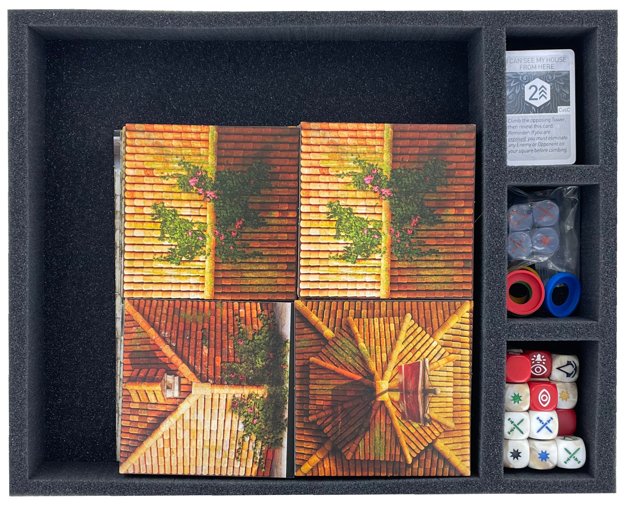 The set offers space for the extra content from the Master Assassin's Pledge of the Kickstarter campaign. For the core game and all unlocked Stretch Goals, we offer a matching foam set with Organizer suitable for the original core game box (CV02Set).