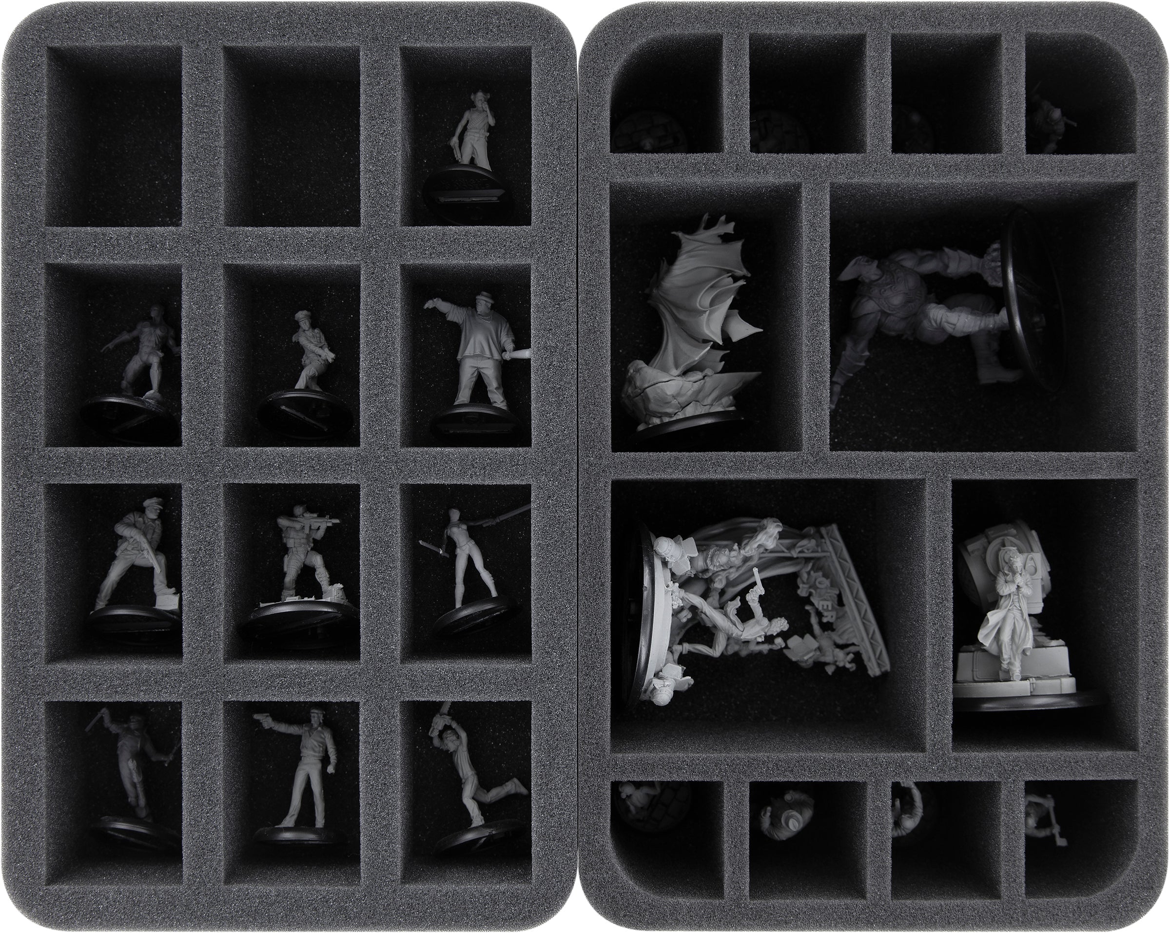Thanks to the custom-fit cut, the miniatures sit tight in their compartments. Even when being transported over the bodies of defeated enemies, the miniatures do not slip and remain in place. The soft, fine-pored foam protects intricate details from breaking off and the colors of your colored models from scratches and paint abrasion.