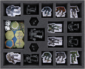 Thoughtful storage solutions for BattleTech help to keep mech miniatures, markers, dice and game material clearly organized and safe to transport, whether for home rounds or tournaments.