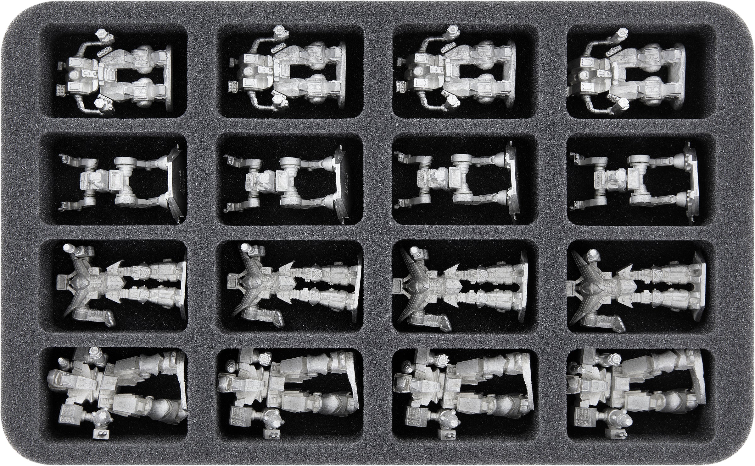 The foam tray with 24 compartments is suitable for up to two companies of Mechs including accessories.