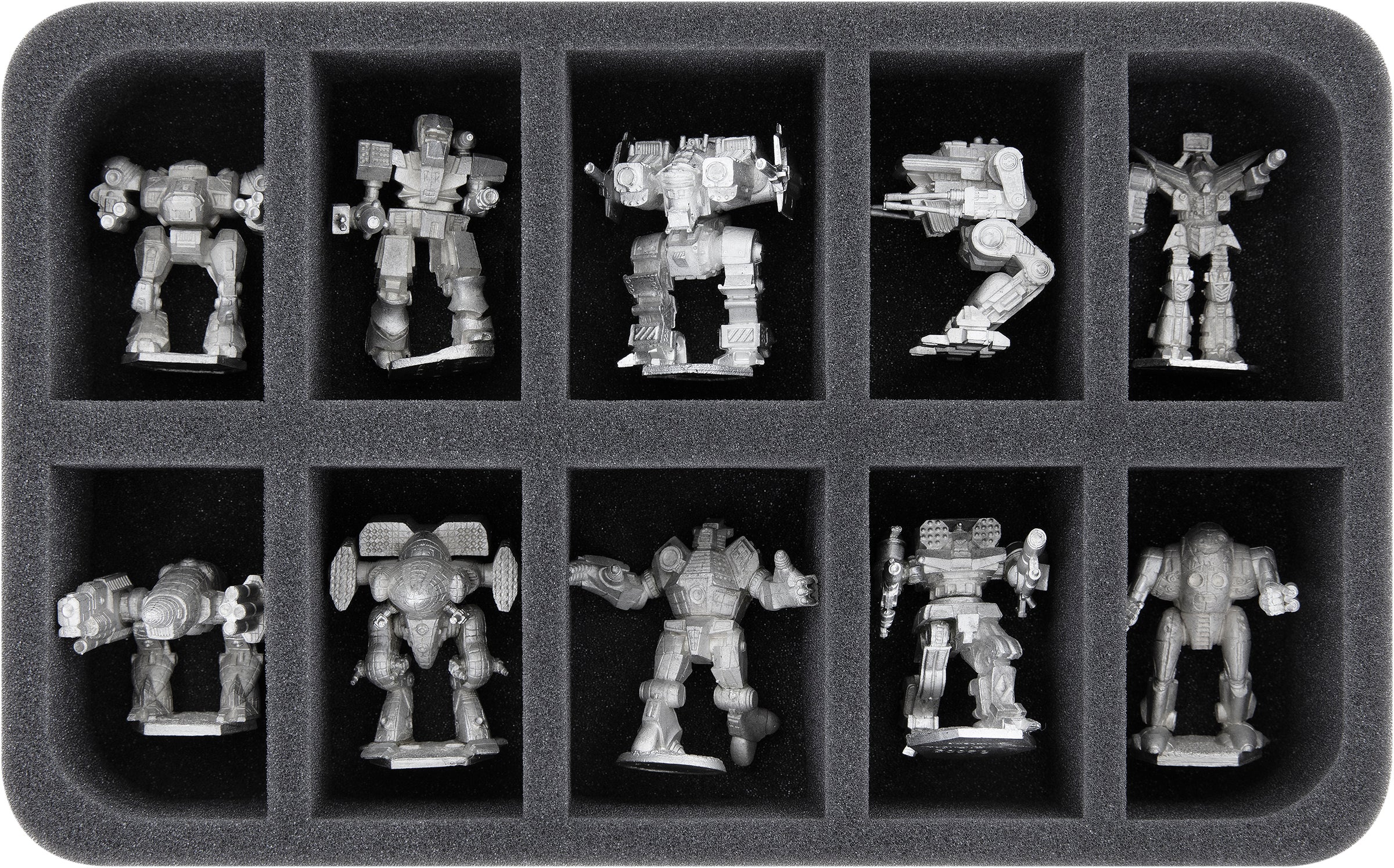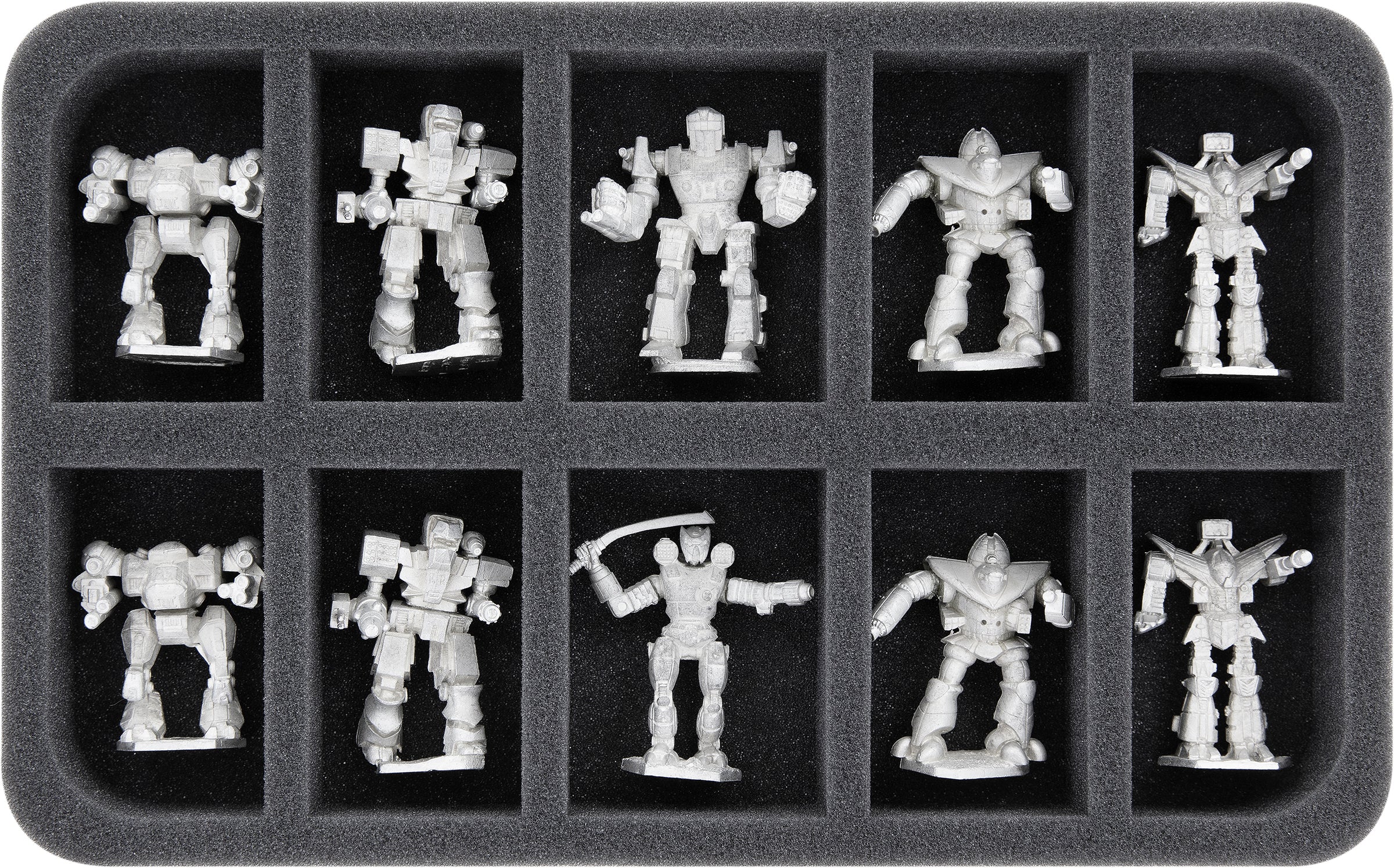 The 2 foam trays with 10 compartments each are suitable for large Mechs and will hold up to 4 lances including accessories.