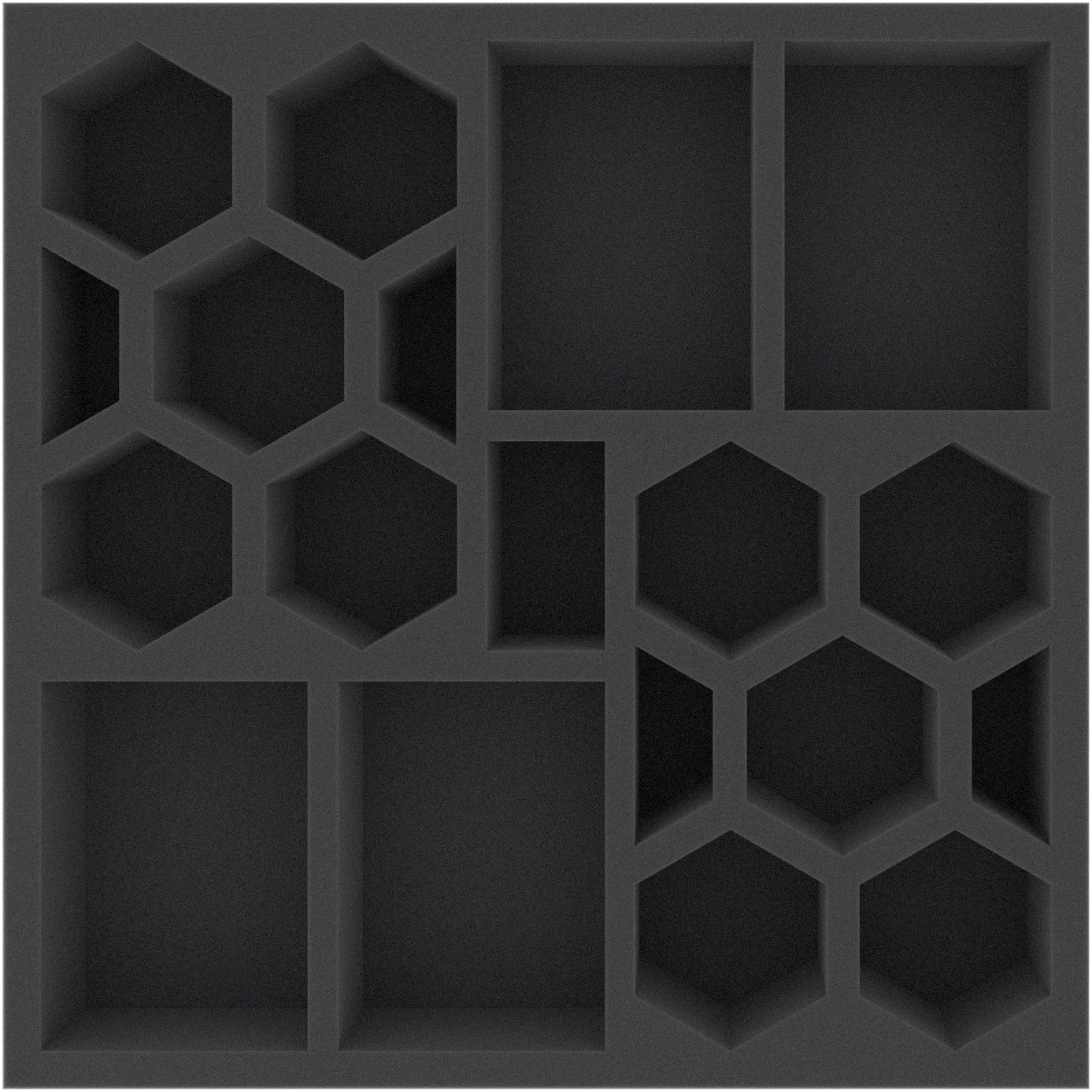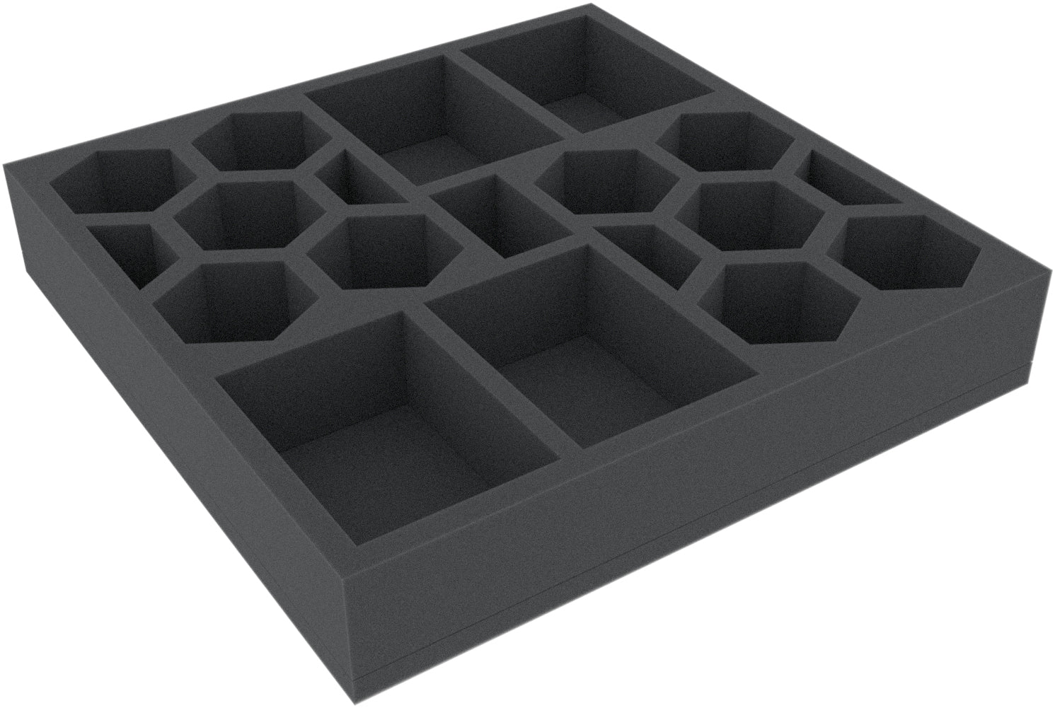 This foam insert is divided into 19 compartments of different sizes. It is particularly suitable as an insert for the safe storage of miniatures and game material in the original board game boxes (e.g. FFG).
