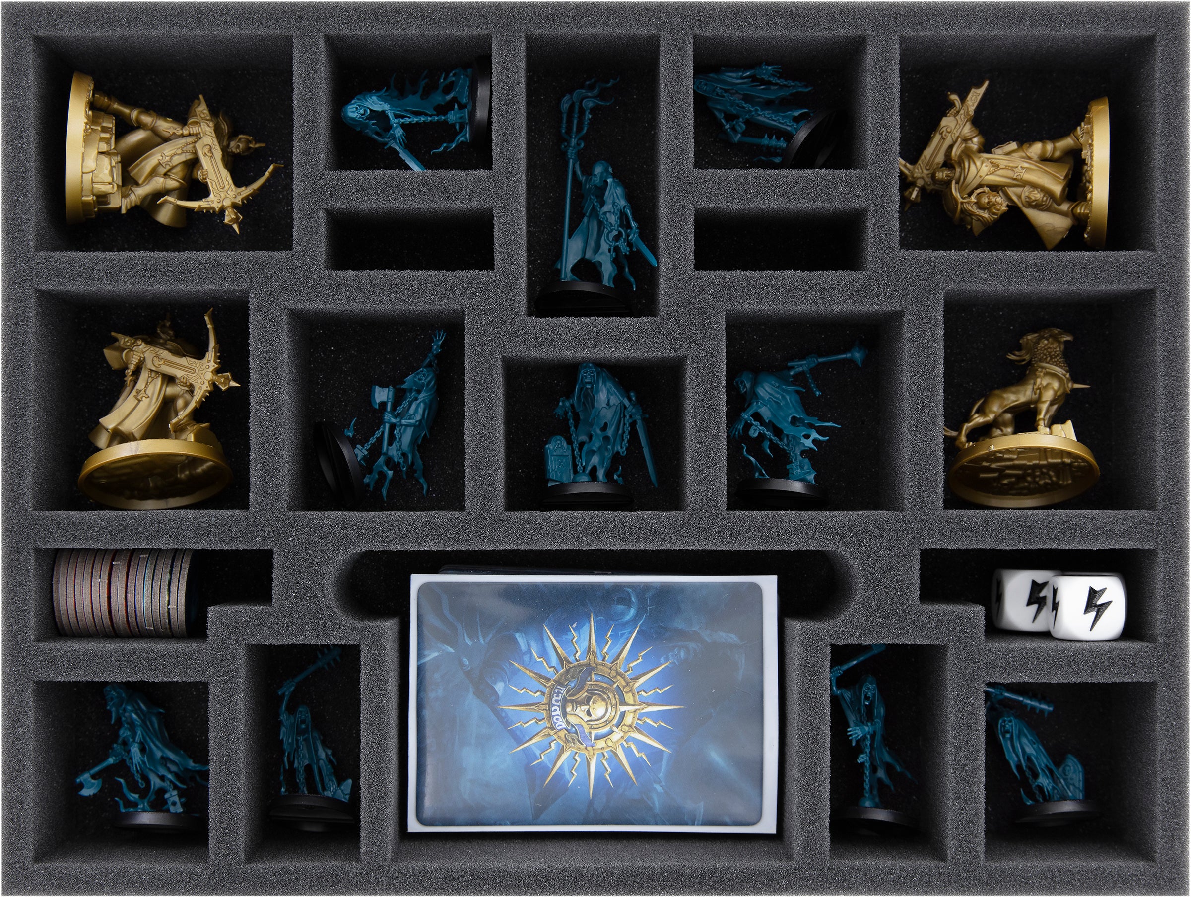 This 50 mm mm high foam tray is divided into 19 compartments. It is particularly suitable for the safe storage of tabletop and board game miniatures, as well as other fragile models and small parts.