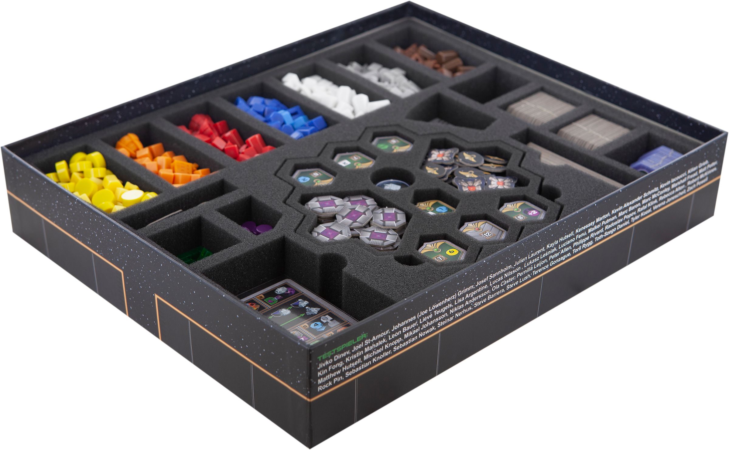 Our Organizer fits exactly into the original board game box. It consists of a foam tray with 19 + 1 compartments and a custom cut, individually removable insert with 10 compartments. For the insert, there is a tailor-made extra-compartment in the tray.