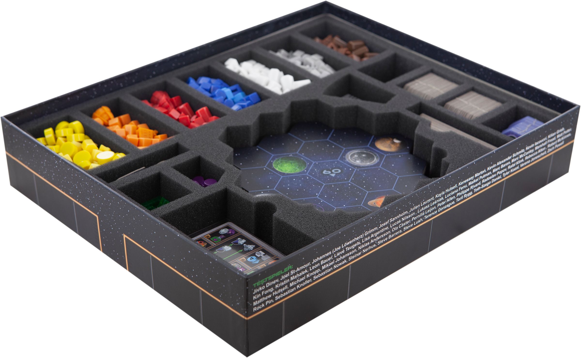The extra-compartment for the removable insert has the same base area as the space sector tiles and features 10 compartments. The 10 compartments provide space for federation tokens, action tokens and record tokens.