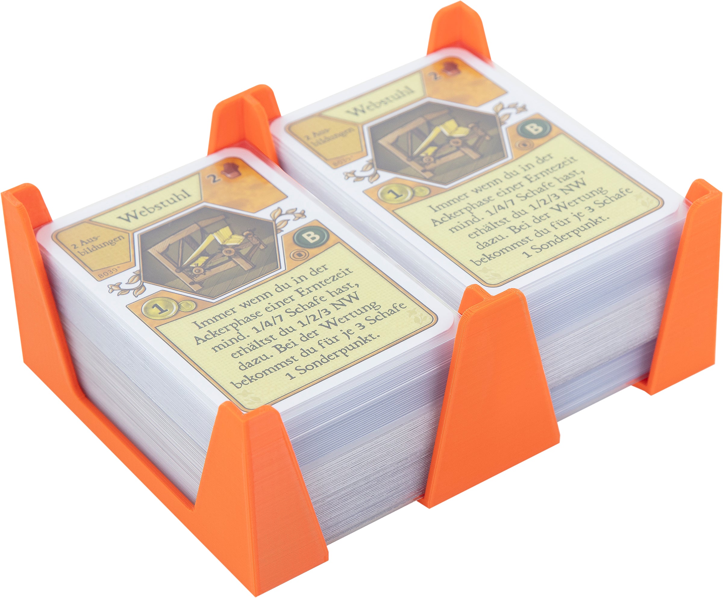 Whether tabletop, card game or board game - the place card holder saves nerves and time. It helps you to organise the different types of cards during the game, ensures that the piles of cards do not tip over even with sleeves and at the end of the game you can easily and neatly sort away your playing cards.