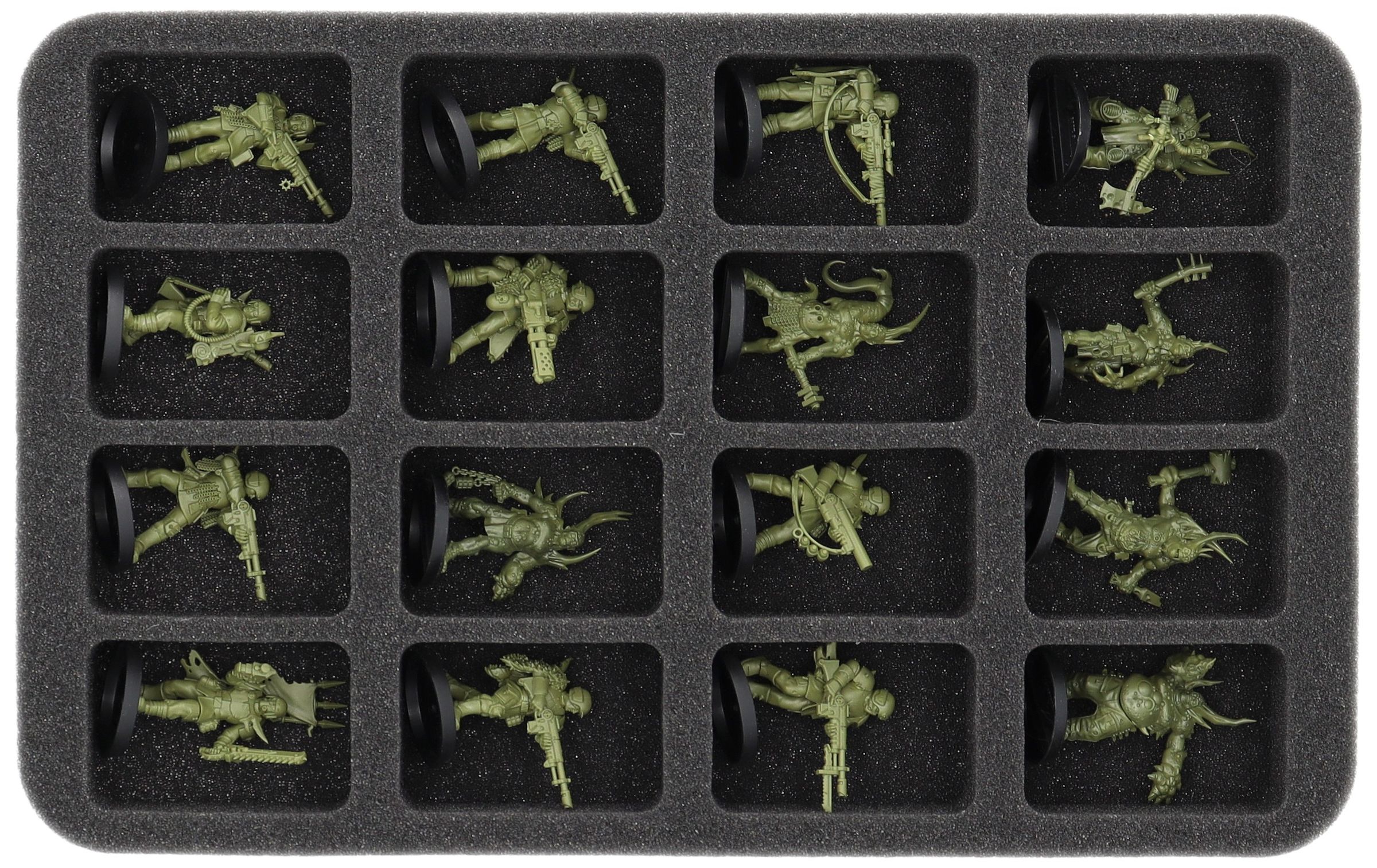• 1 Half-Size foam trays with 16 compartments for miniatures like Pox Walkers, Traitor Guardsmen and miniatures with similar dimensions (HS035BF05BO)