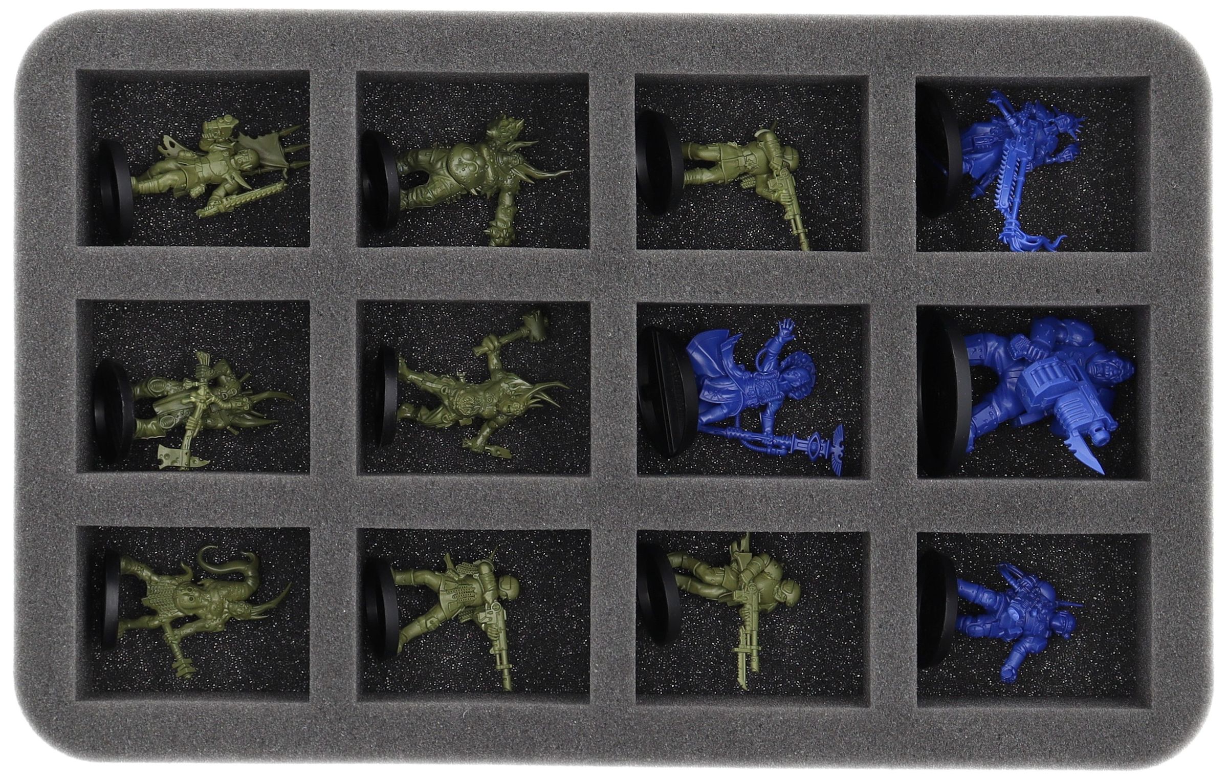 • 1 Half-Size foam trays with 12 compartments for miniatures like Pox Walkers, Traitor Guardsmen and miniatures with similar dimensions (HS050I012BO)