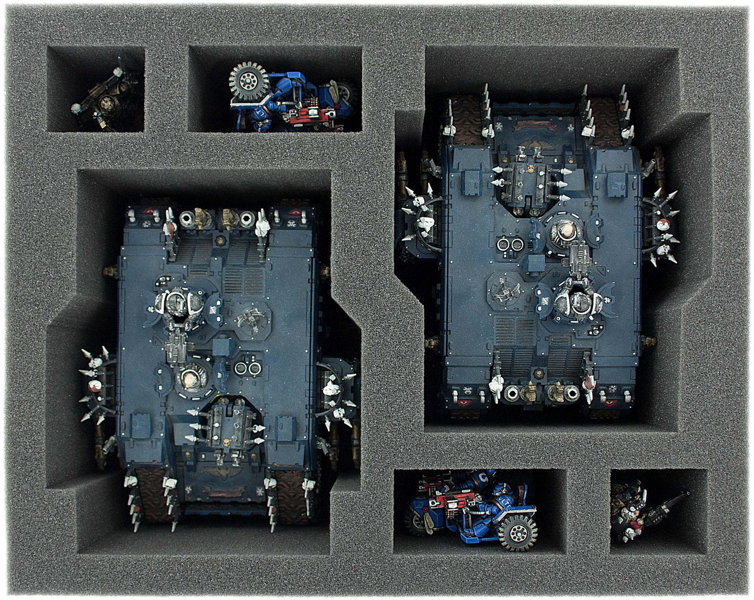 • 1 Full-Size foam tray with 2 miniature-precisely cut compartment for two Land Raiders + 4 compartments for Terminator Captain, Chaplain in Terminator Armor and models with similar dimensions (FS110A005)