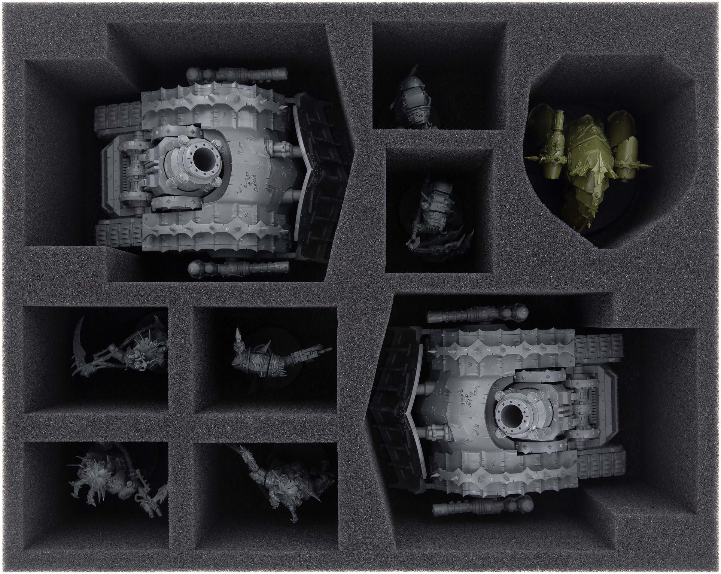 • 1 Full-Size foam tray with 3 miniature-precisely cut compartment for two Death Guard siege tanks, Myphitic Blight-hauler + 6 compartments for Deathshroud Bodyguards, Poxwalker, Plague Marines and models with similar dimensions (FSMEFM090BO)