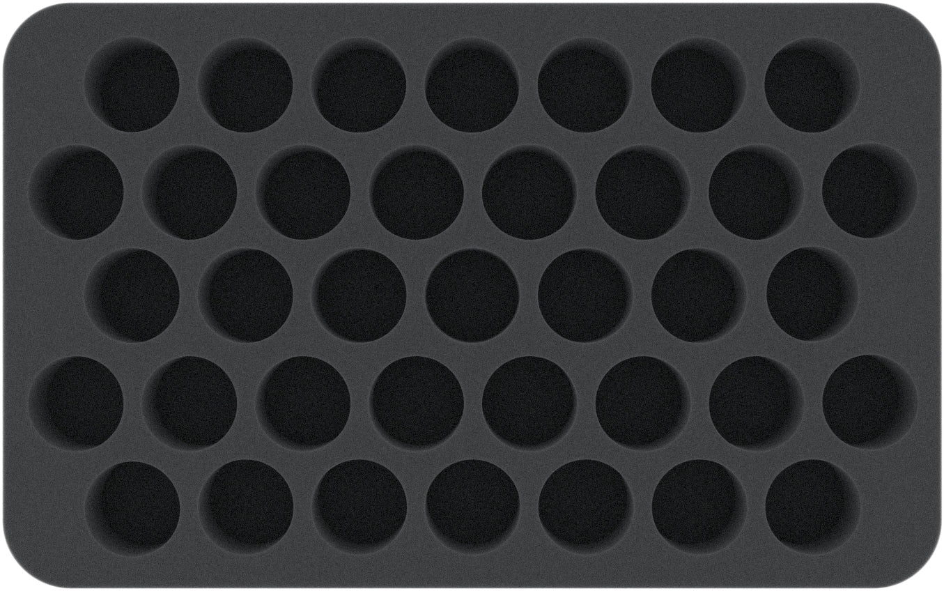 This Half-Size foam tray is divided into 37 compartments of the same size. The round compartments are particularly suitable for protecting small figures for various board games and tabletop systems.