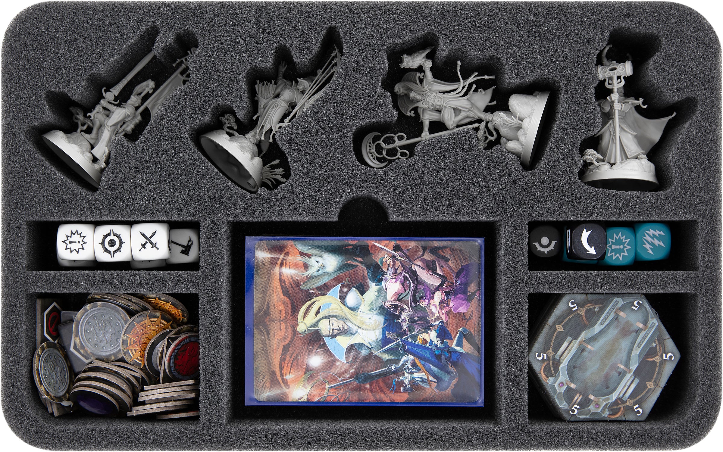 A total of 9 compartments keep your miniatures protected and help you sort your game materials. Myari Lightcaller, Senaela, Bahannar, and Ailenn the Mind’s Edge, are kept safe in miniature-precise cut compartments.