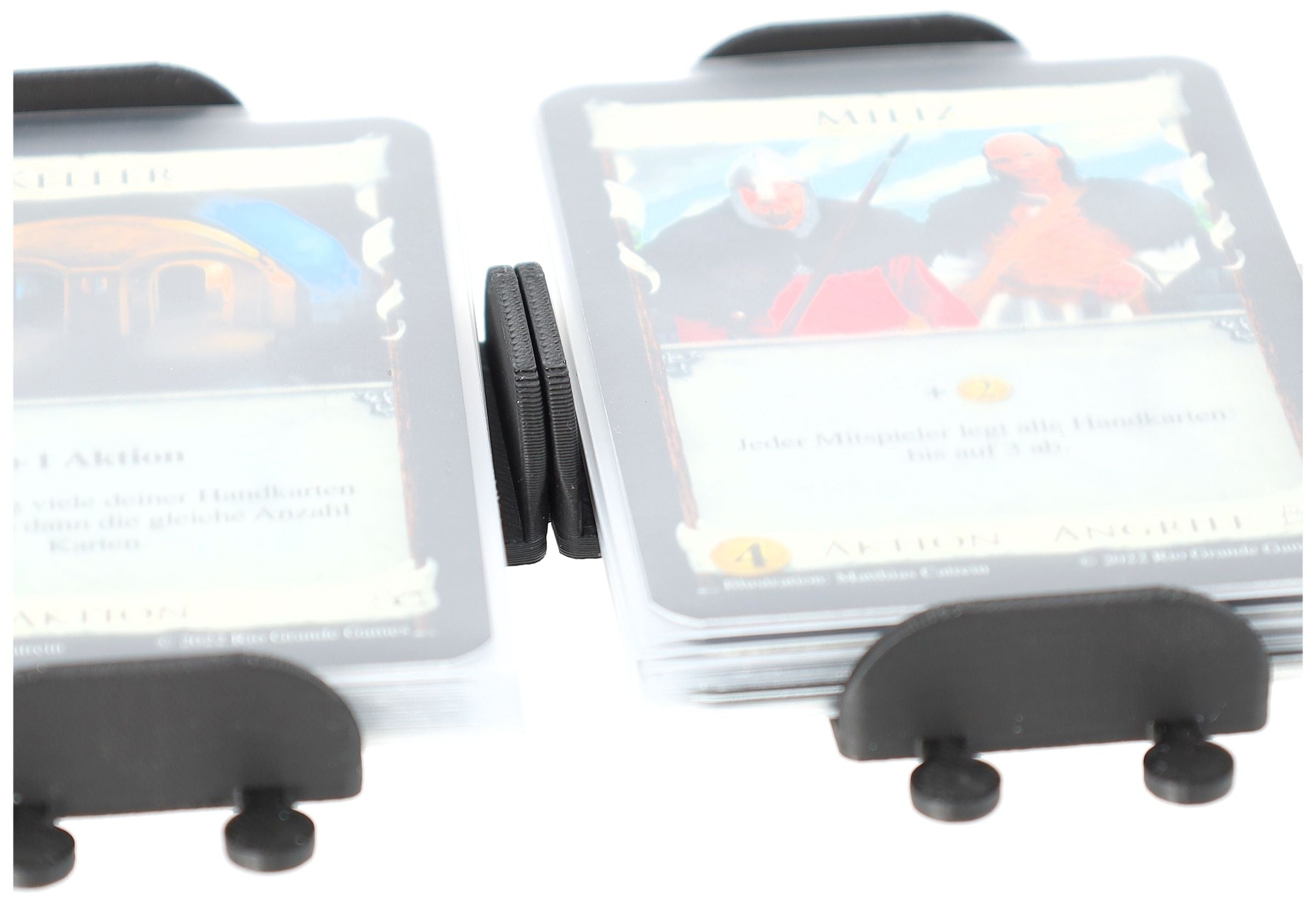 With this plastic Feldherr card deck holder for Dominion, you create order on the tabletop and prevent the multiple card stacks from getting mixed up.