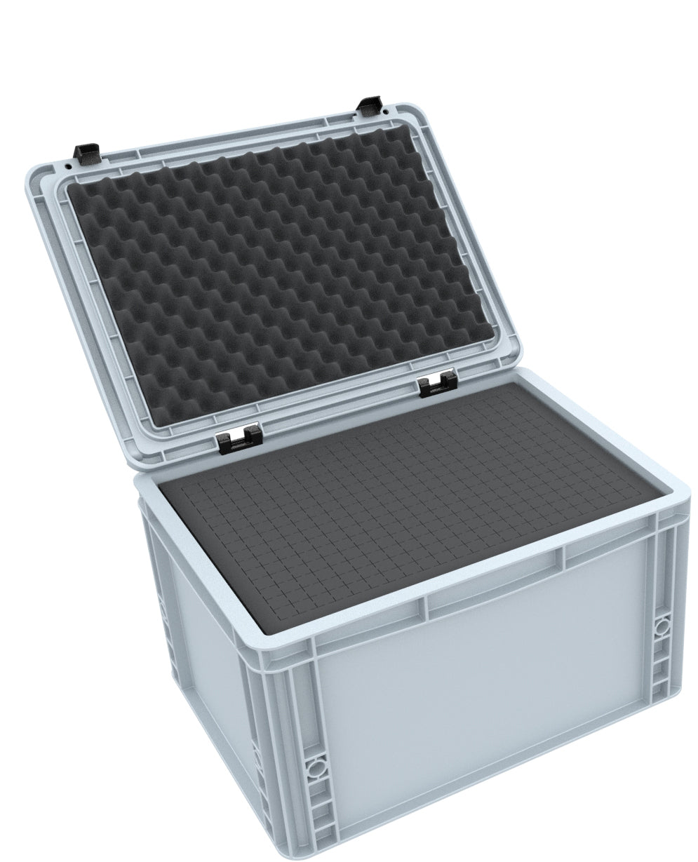 Set of Eurobox 400 mm x 300 mm x 235 mm filled with 2 Pick and Pluck foam inserts.