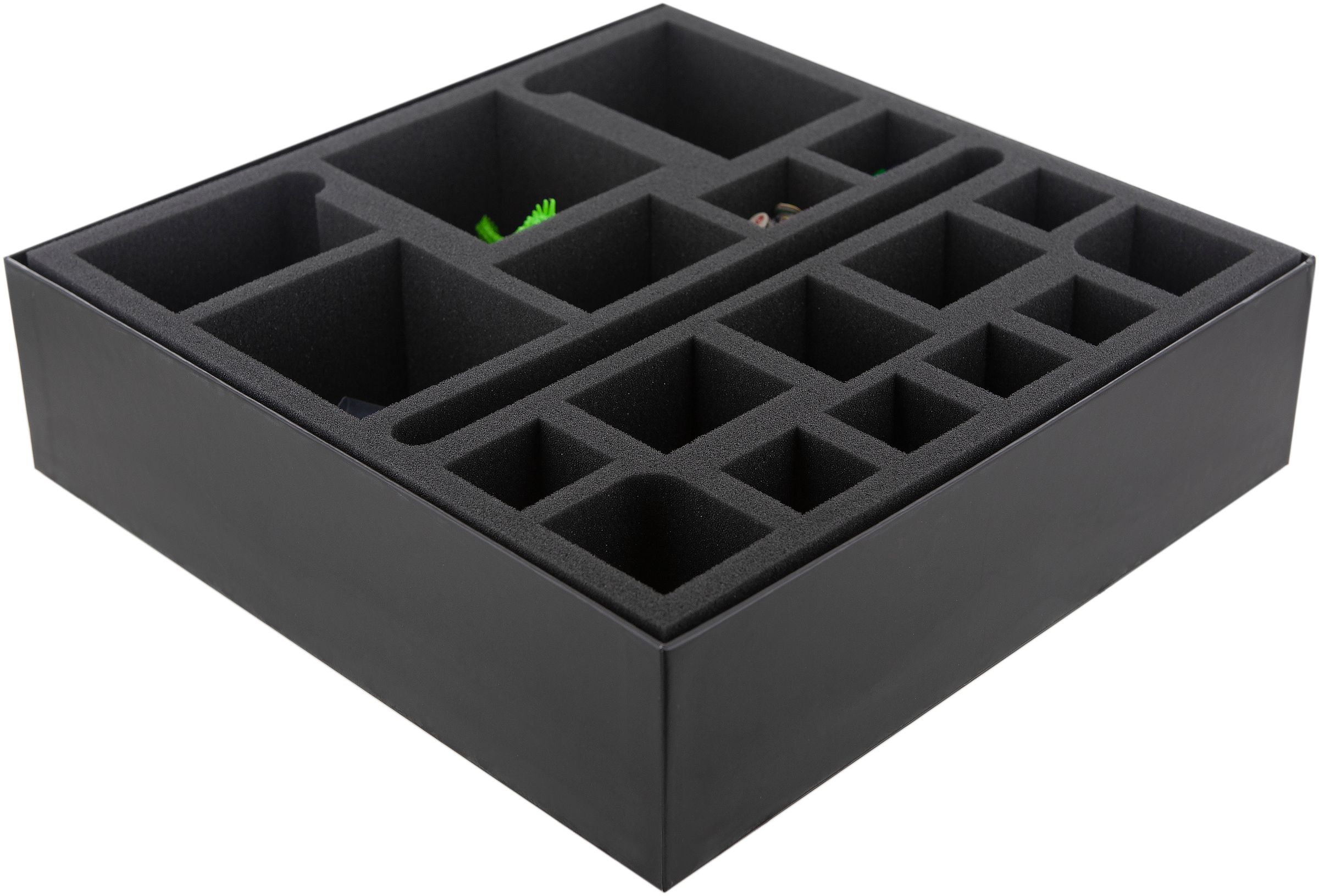 • Fits like a glove. Your models, dice and tokens fit exactly into the tray, the tray exactly into the game box. When done, place the foam topper, then the rule- and the campaign books on top and close the lid. Off you go!
