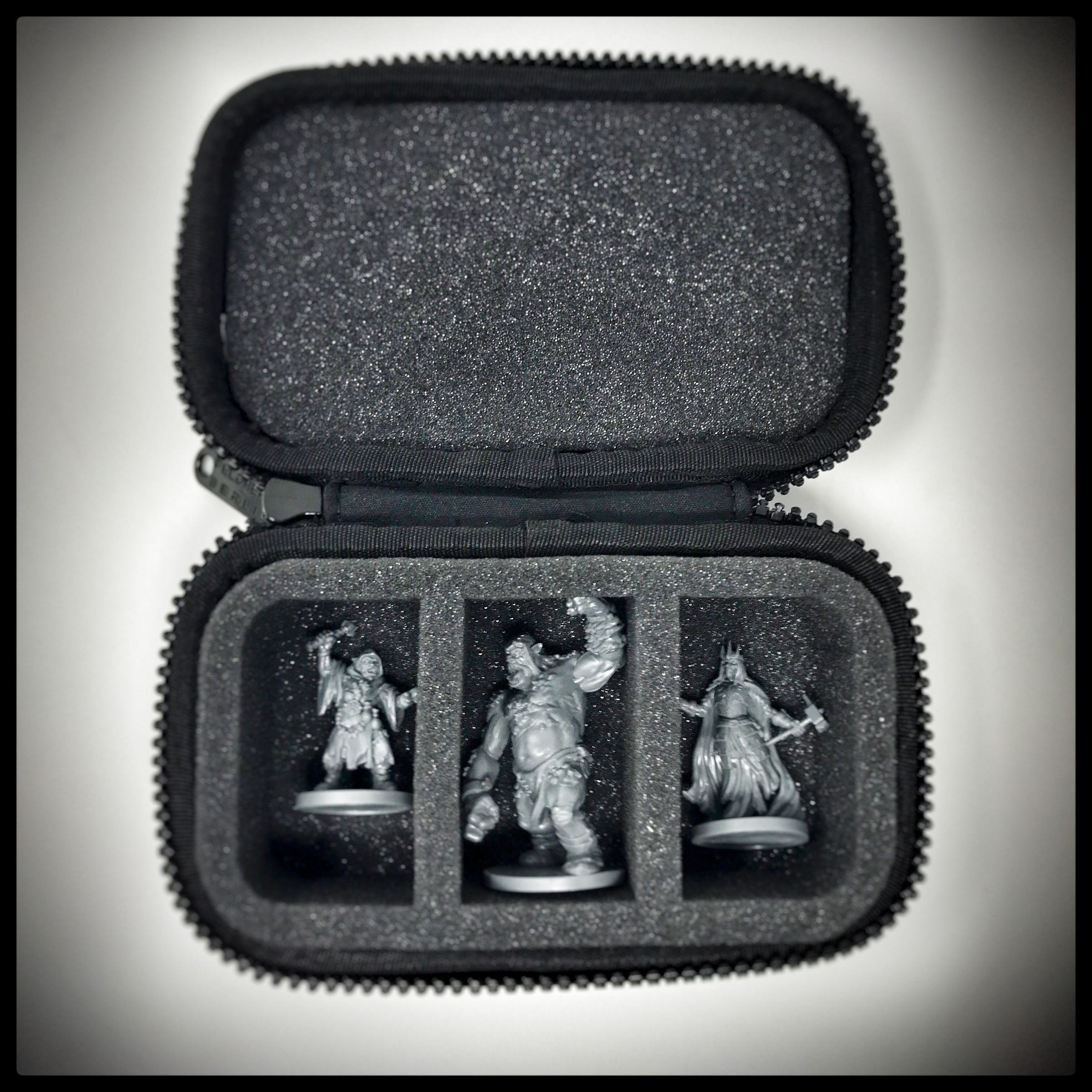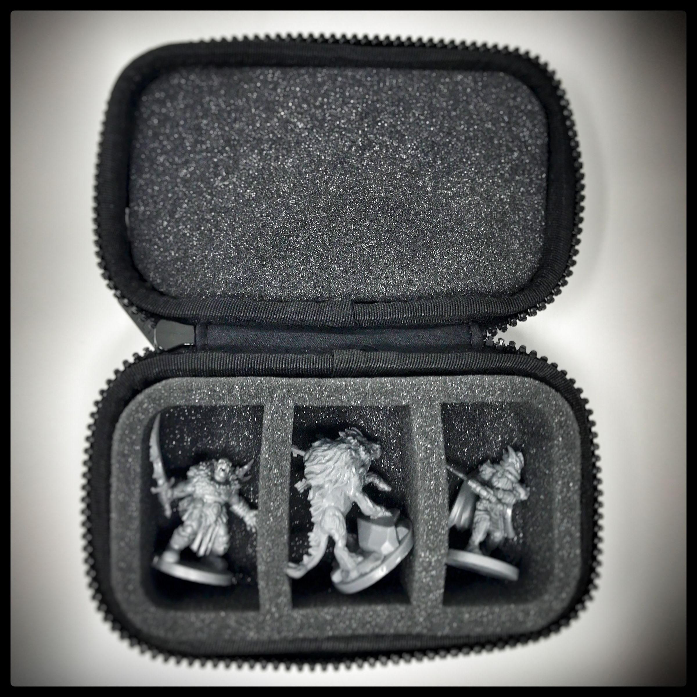 The small case with the foam insert offers you a permanent all-round protection for 3 miniatures. The three equal-sized compartments made of soft foam protect the sensitive details of the rogue figures just as reliably from damage as they protect the colors of painted miniatures from scratches and abrasion.