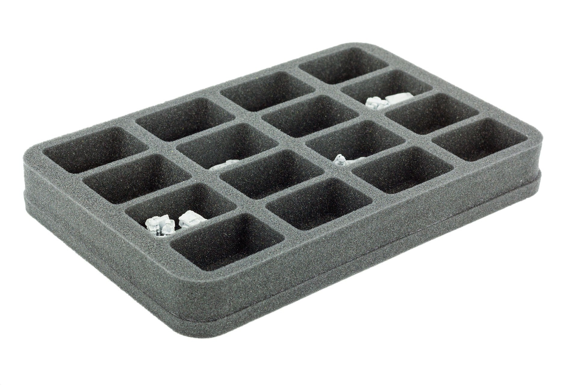 Foam Tray will hold 16 medium based FoW Miniatures. The 35 mm depth of the foam is result from 10 mm foam base and slot foam tray with 25 mm effective depth.