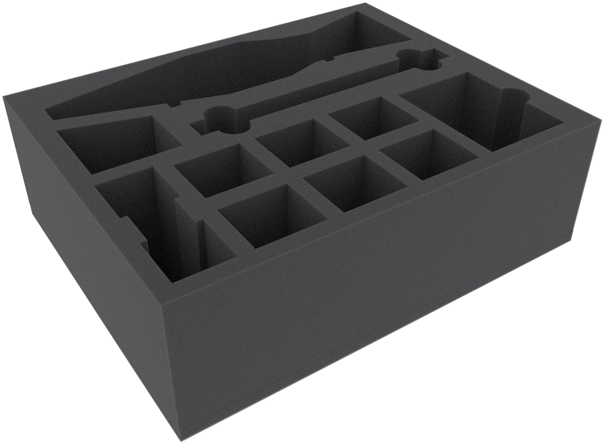 The Full-Size foam tray has the dimensions: 345 mm x 275 mm x 110 mm total height (100 mm usable height + 10 mm foam base).