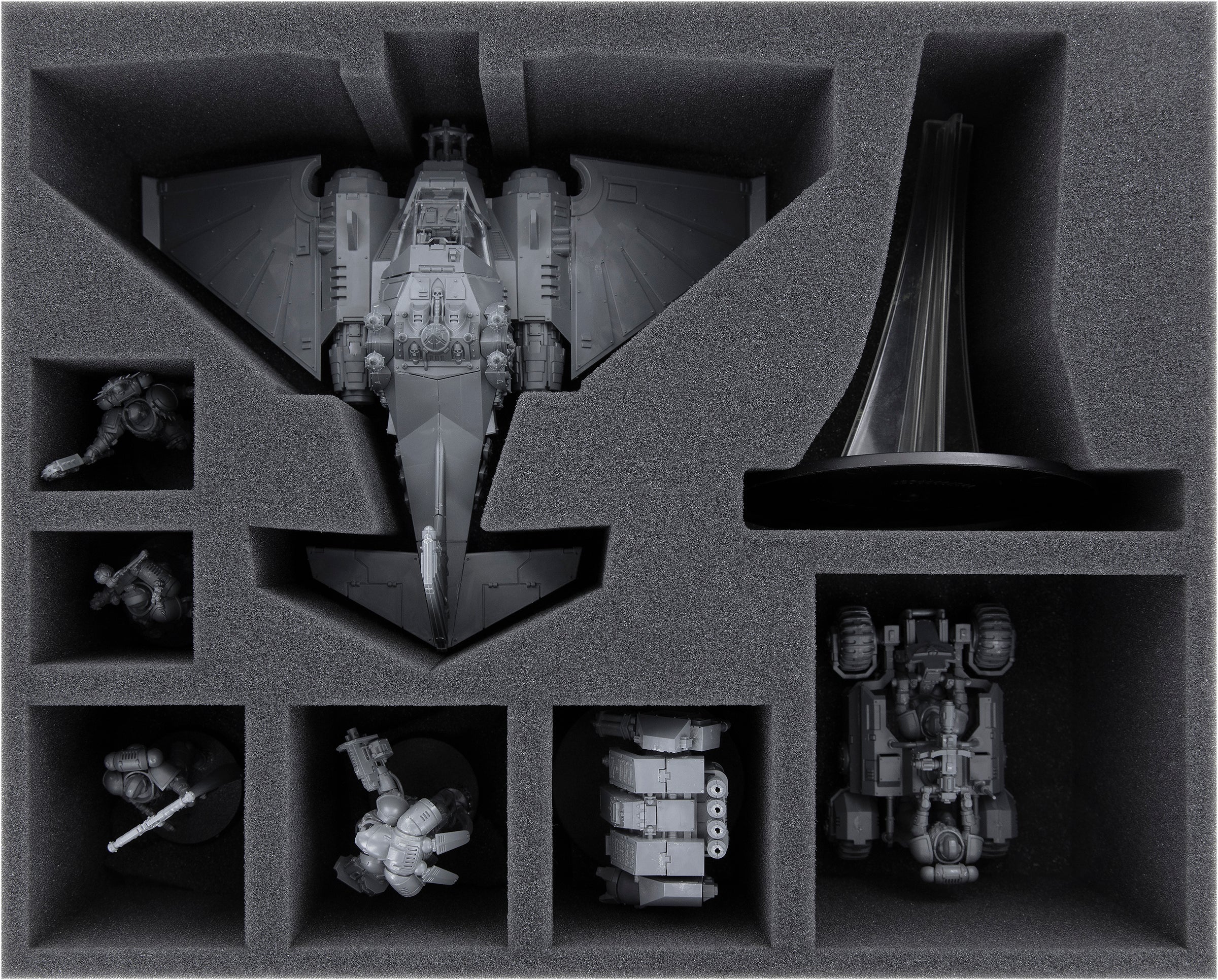 This Feldherr foam tray fits a Dark Angel's Nephilim Jetfighter, or its Ravenwing Dark Talon build variant. Provides reliable protection and ensures that your fighter arrives at its destination unharmed.