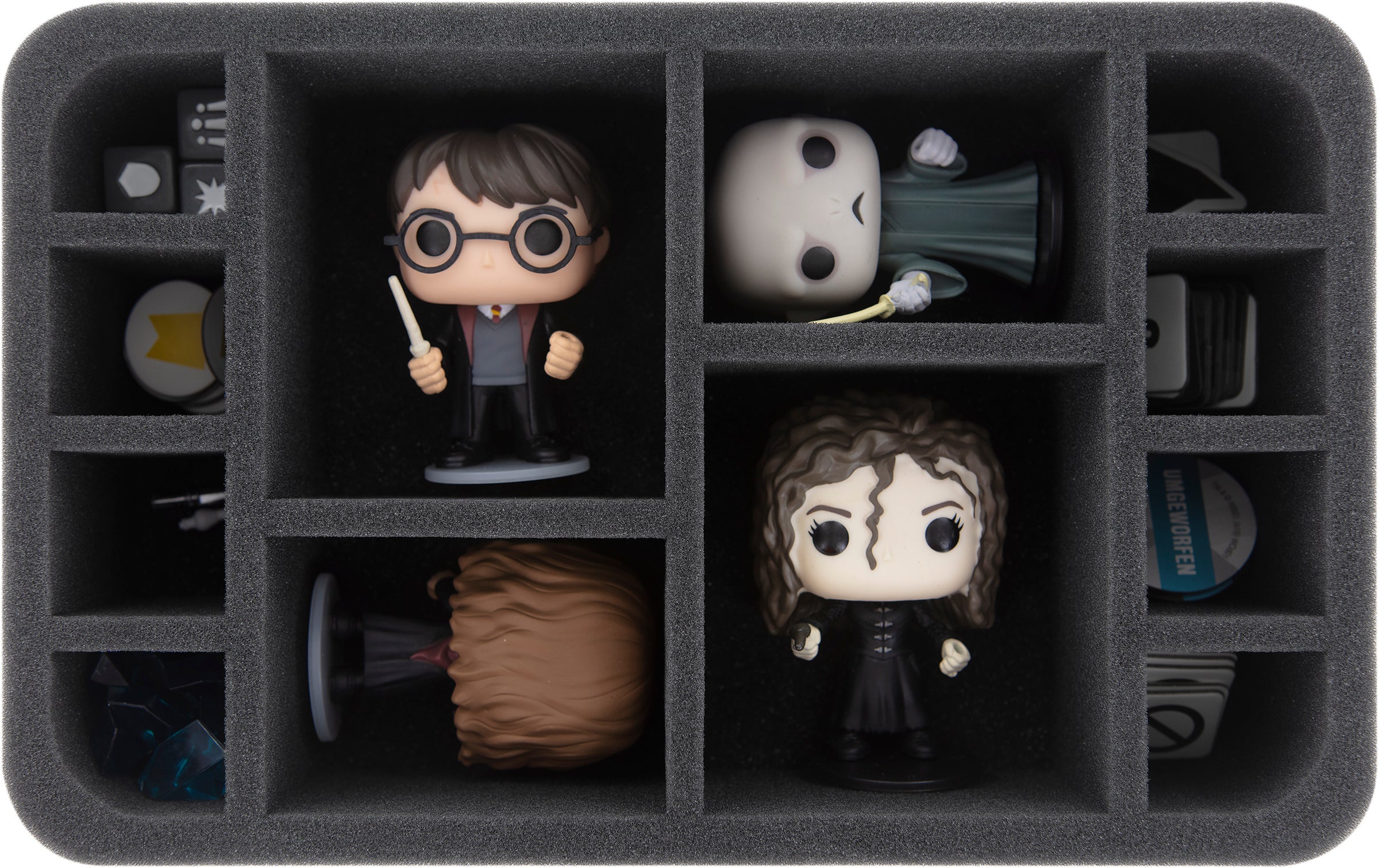 In the Half-Size foam tray with 12 compartments, the 4 Funkoverse POP! figures of the base game "Funkoverse Strategy Game: Harry Potter 100" fit exactly into the large compartments. Because each miniature gets its own compartment, they do not bump into each other outside the game. The small compartments allow sorting the dice, points and tokens. Everything can be found quickly. Nothing gets lost.