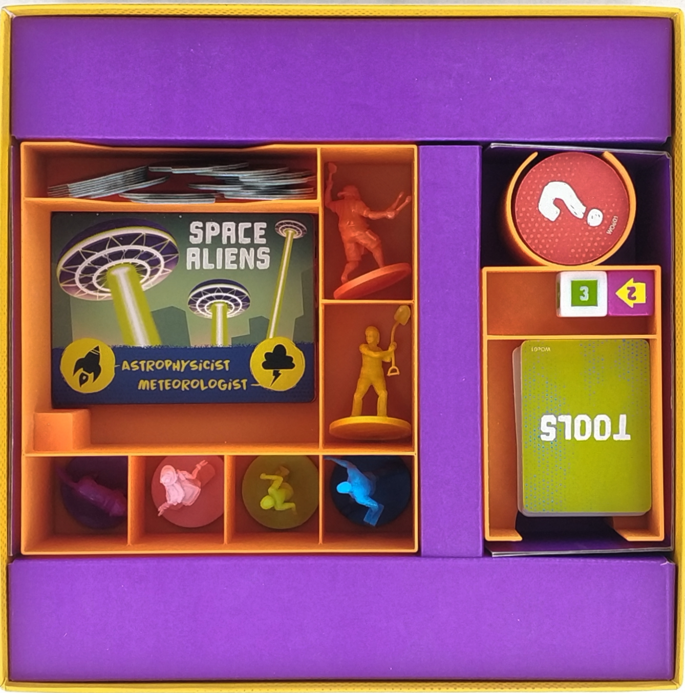 - 1 plastic card holder with three compartments for small-format playing like tool cards + dice and science tokens