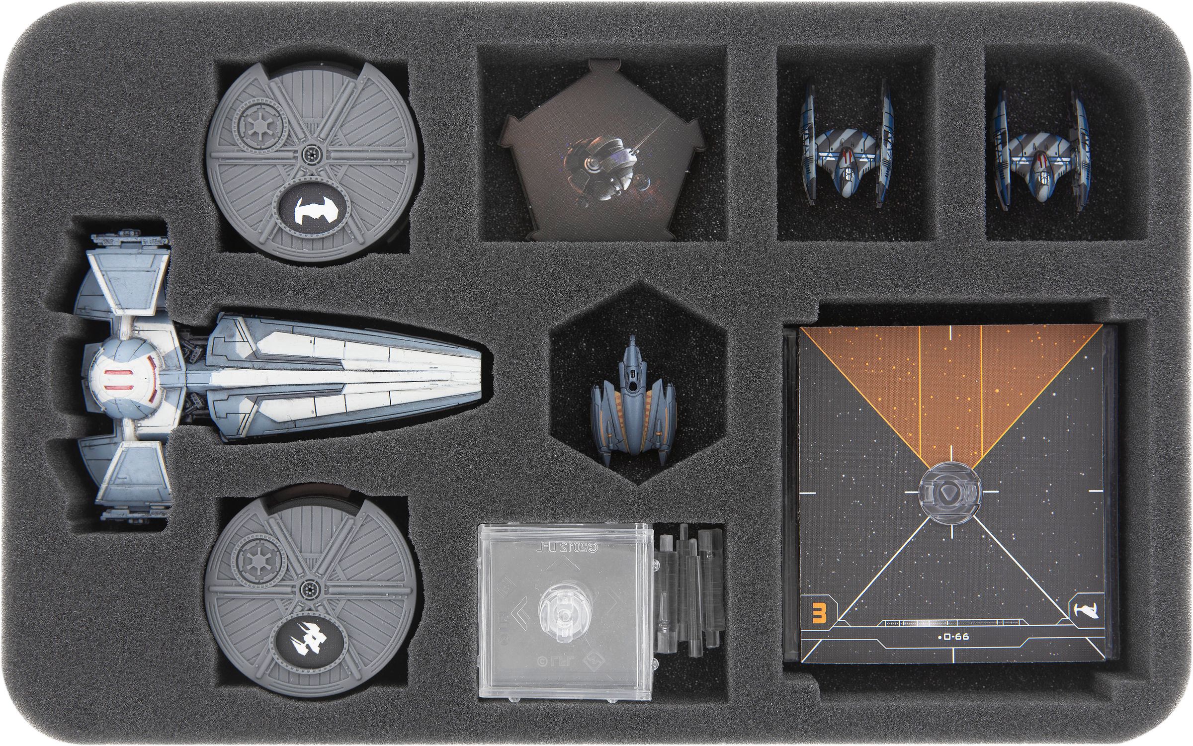 A miniature-precise cut compartment offers the Sith Infiltrator a safe place on this Half-Size insert. The model fits in here both ways, with the wings folded in or out. The custom-fit cut prevents the ship's miniature from slipping around during transport and thus not only protects the wings from damage, but also the colors from abrasion and scratches.