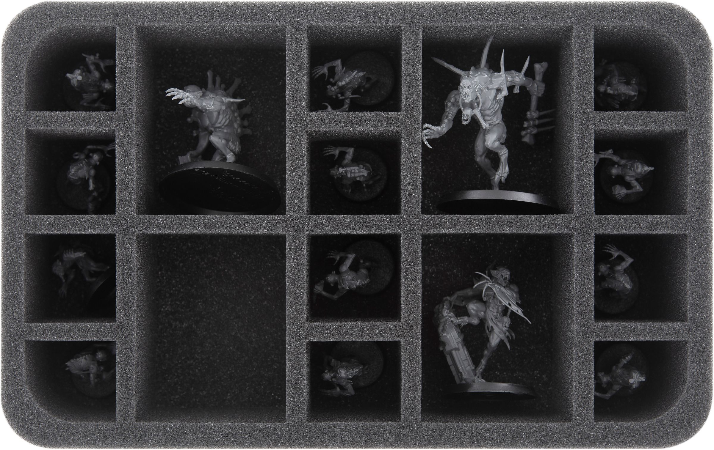 2x HSCW075BO: The 12 compartments on each of these two Half-Size foam trays are divided into three different sizes. The inserts are suitable for larger ghouls, as well as for small miniatures. Two compartments on each of the trays are ideal for winged Crypt Infernal Courtier, the medium-sized compartments will hold e. g. Crypt Horrors. The eight small compartments are optimal for miniatures in the size of Crypt Ghouls.
