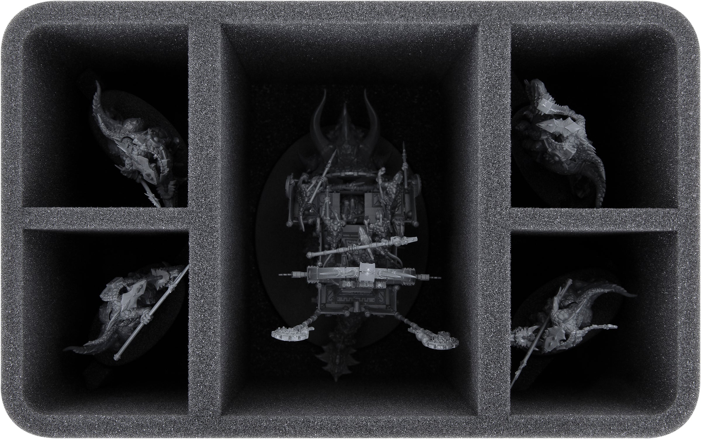 The large compartment of the Feldherr Half-Size foam tray has room for a bulky model of the Seraphon, such as Engine of the Gods or Stegadons. In the four remaining compartments you can safely store four more models.