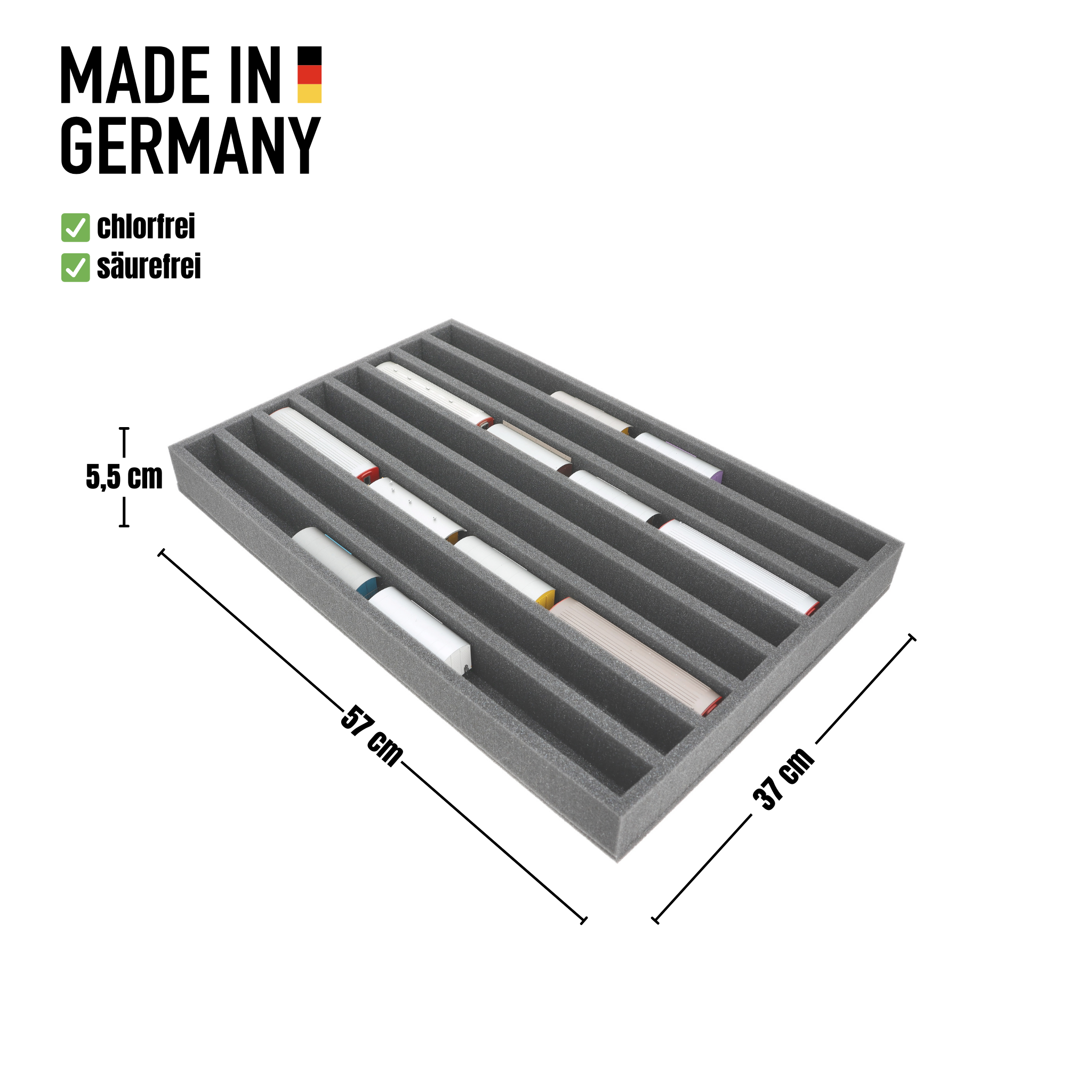 The foam insert has the dimensions: 570 mm x 370 mm x 55 mm total height (45 mm usable height + 10 mm foam base).