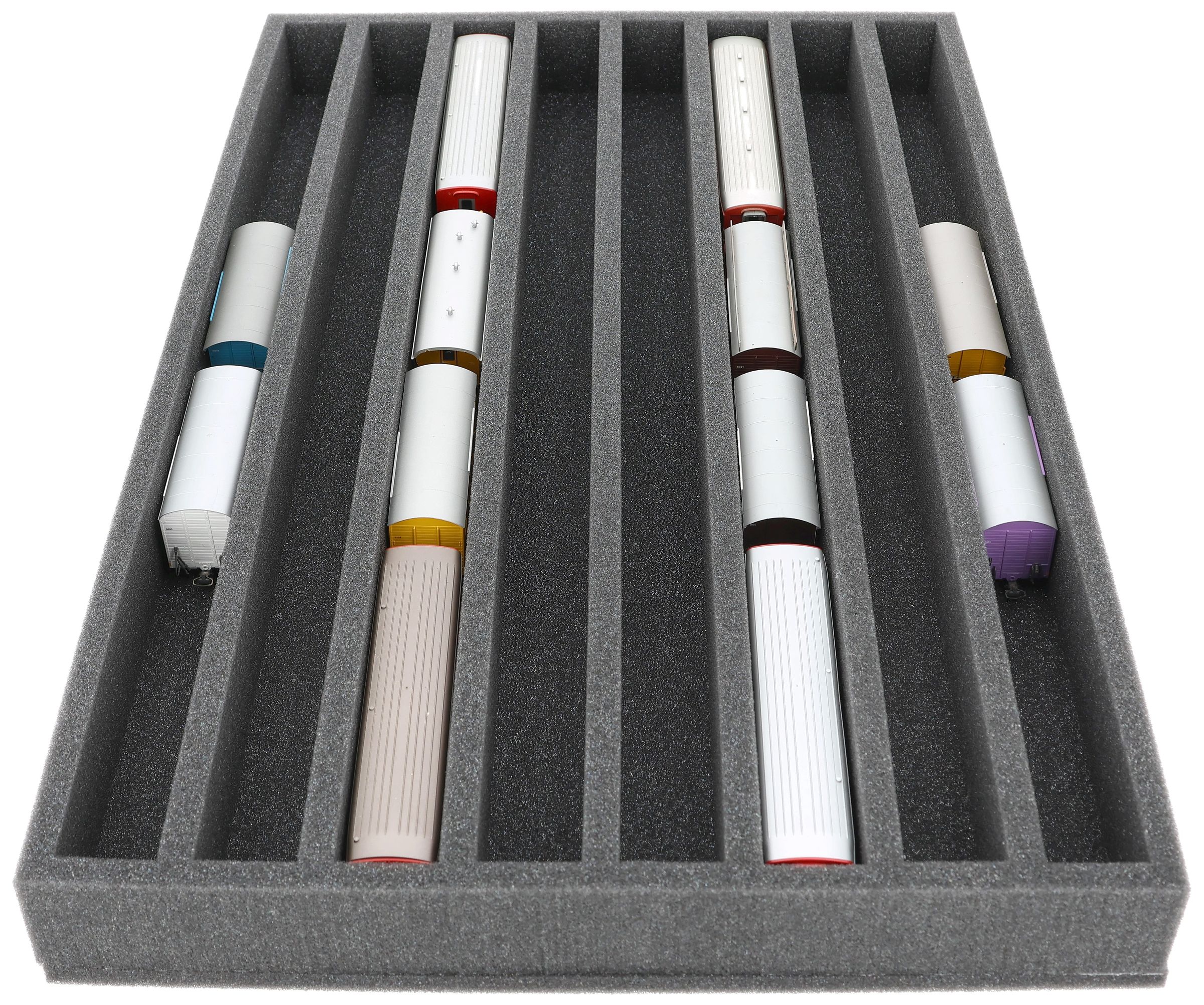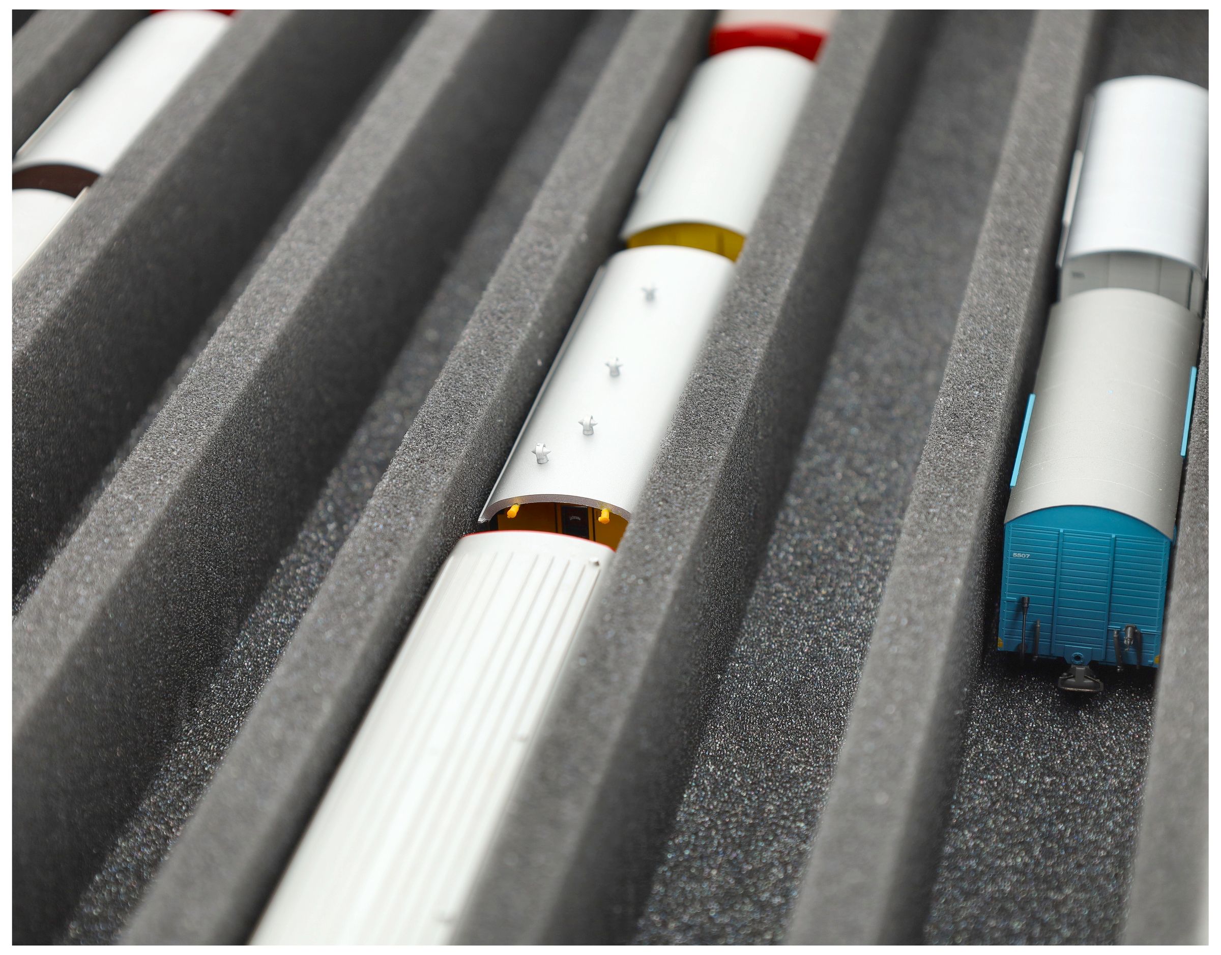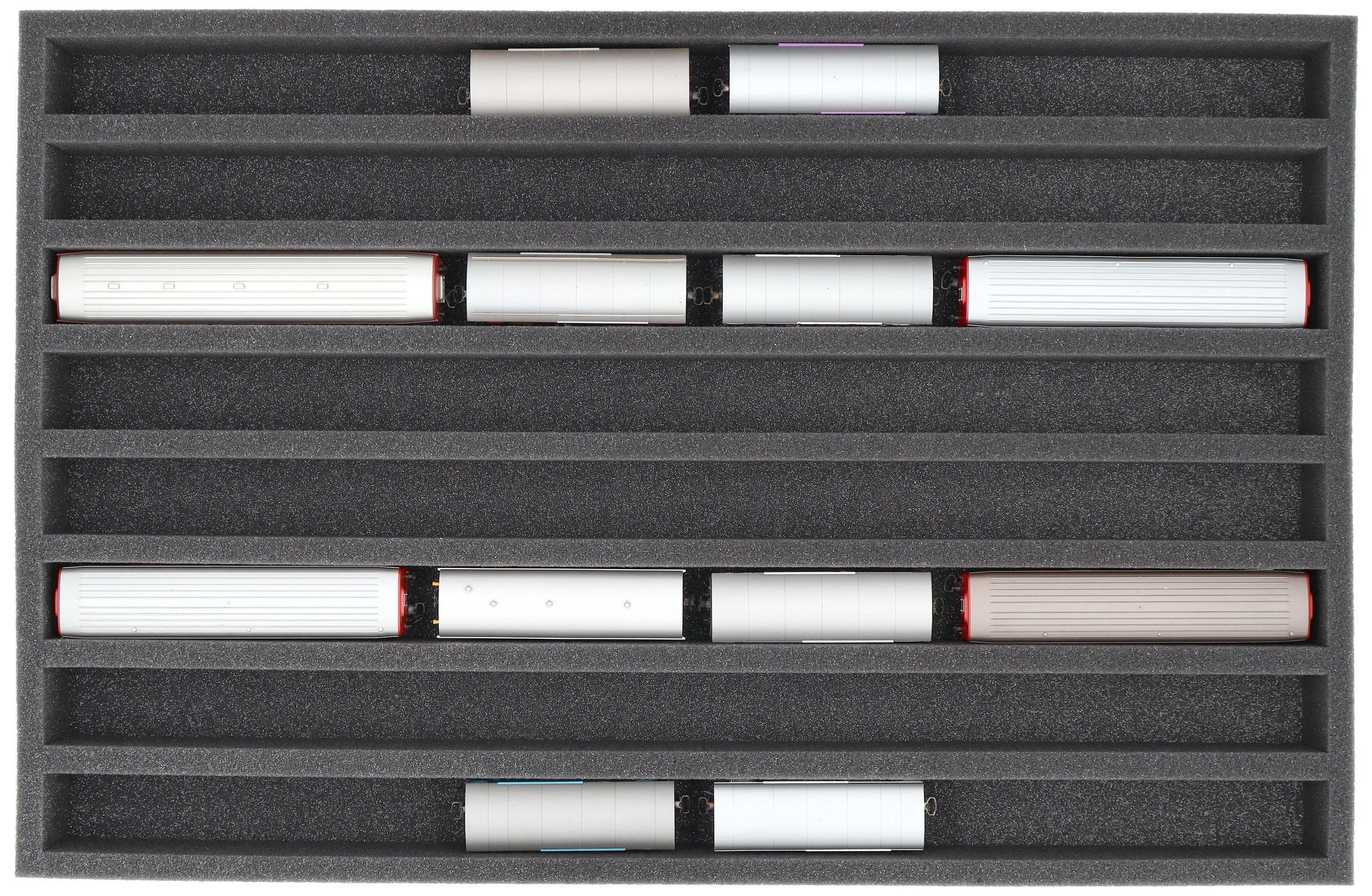 Whether for transport to exhibitions, module meetings, or safe storage on shelves at home, this insert keeps your H0m scale locomotives and cars reliably protected. The 8 compartments hold the models upright and shield them from bumps and scratches.