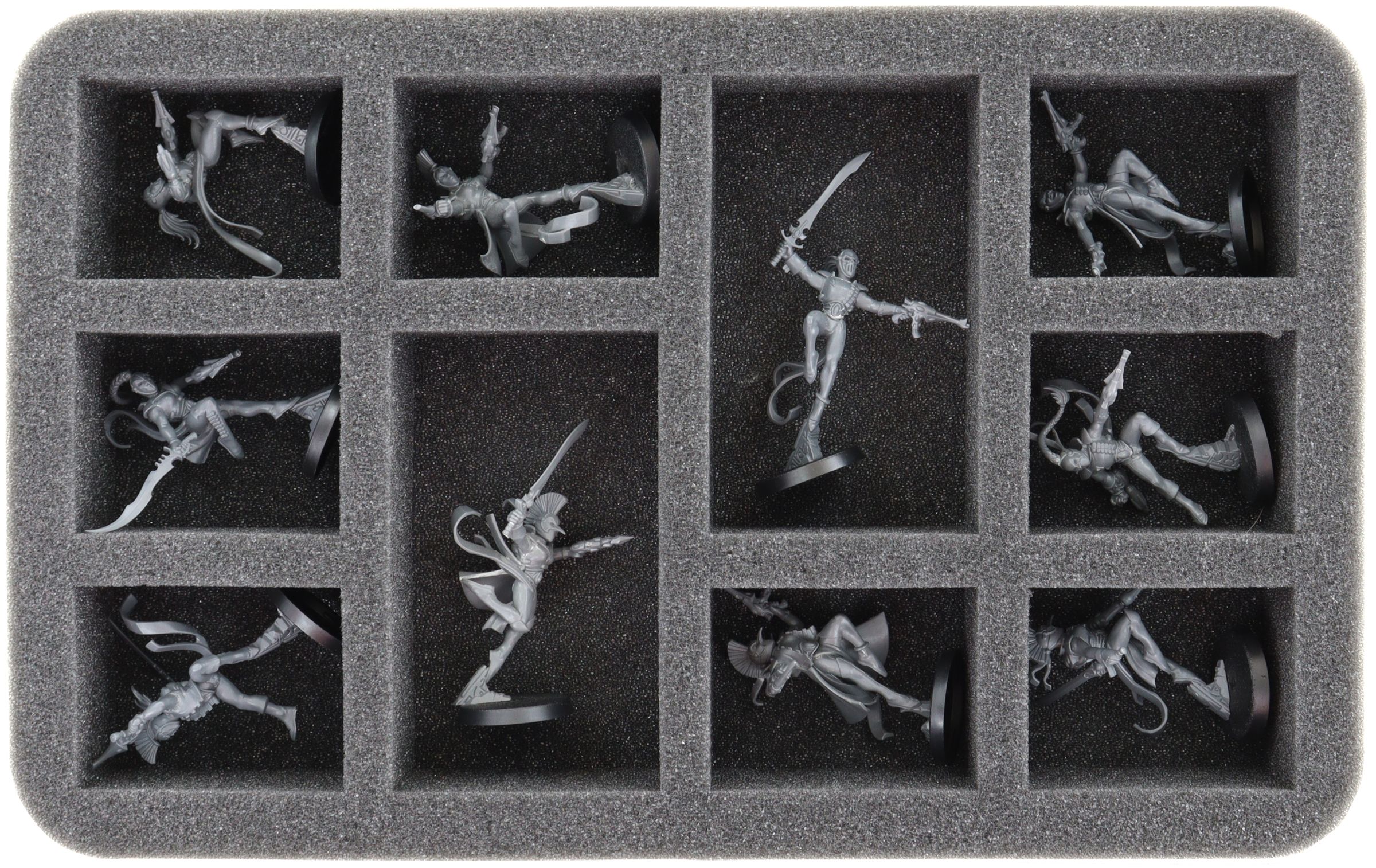 • 1 Half-Size foam tray with 10 compartments for bulky miniatures such as Shadowseer, Death Jester, Solitaire, Harlequin Troupe and models with similar dimensions (HS045A029)