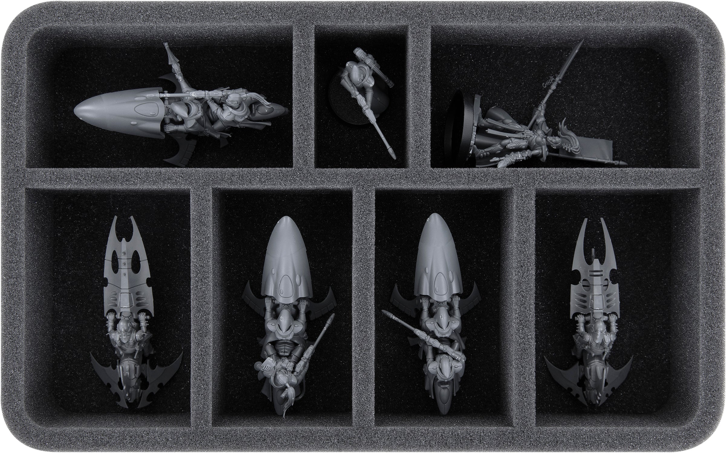 • 1 Half-Size foam tray with 7 compartments for Starweaver/Voideaver without flight base + bulky miniatures such as Shadowseer, Death Jester and models with similar dimensions + separate flight base (HS080A027)