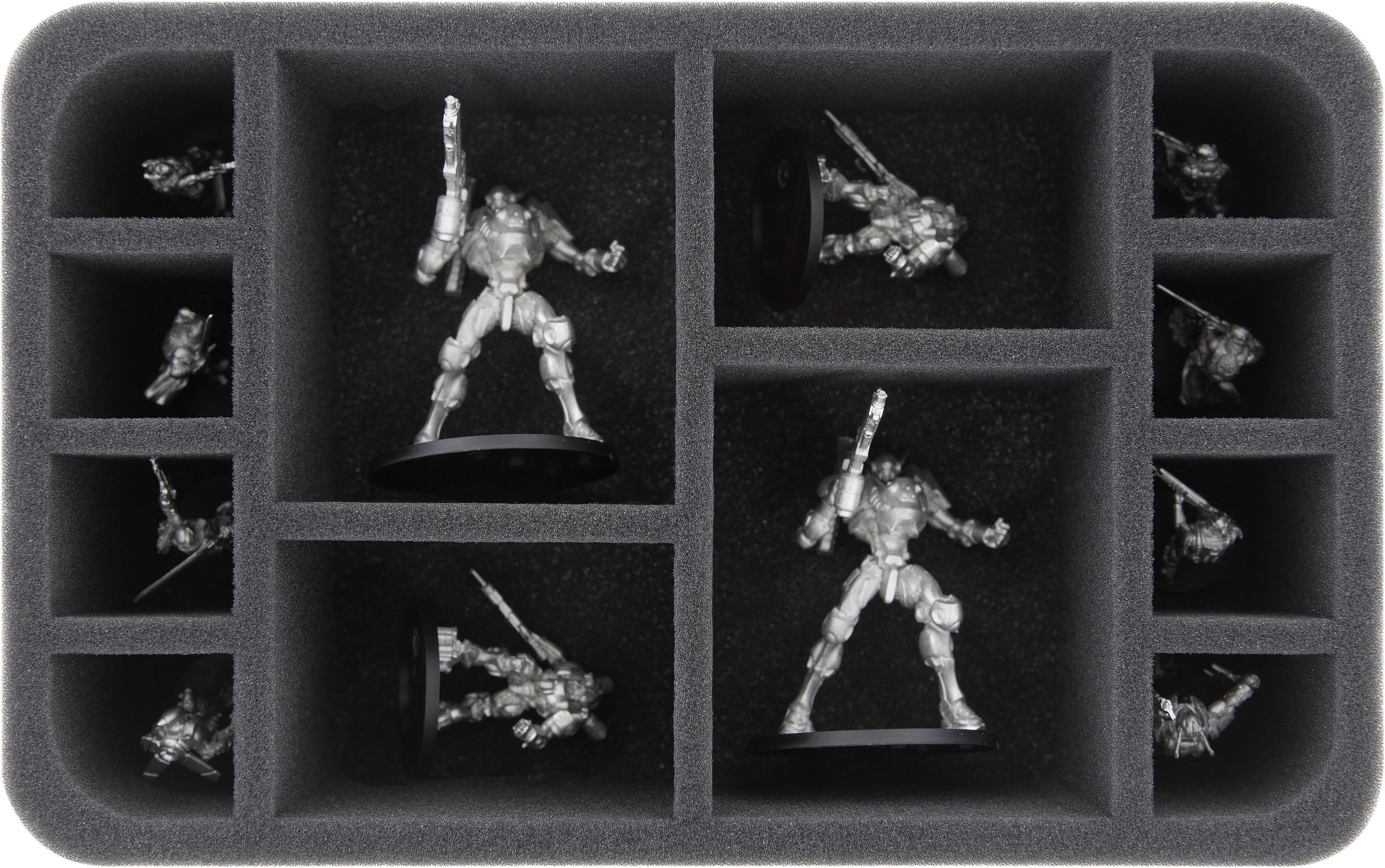 • 1 foam tray with 16 compartments for miniatures on 40 mm and 25 mm bases (HSCU060BO)